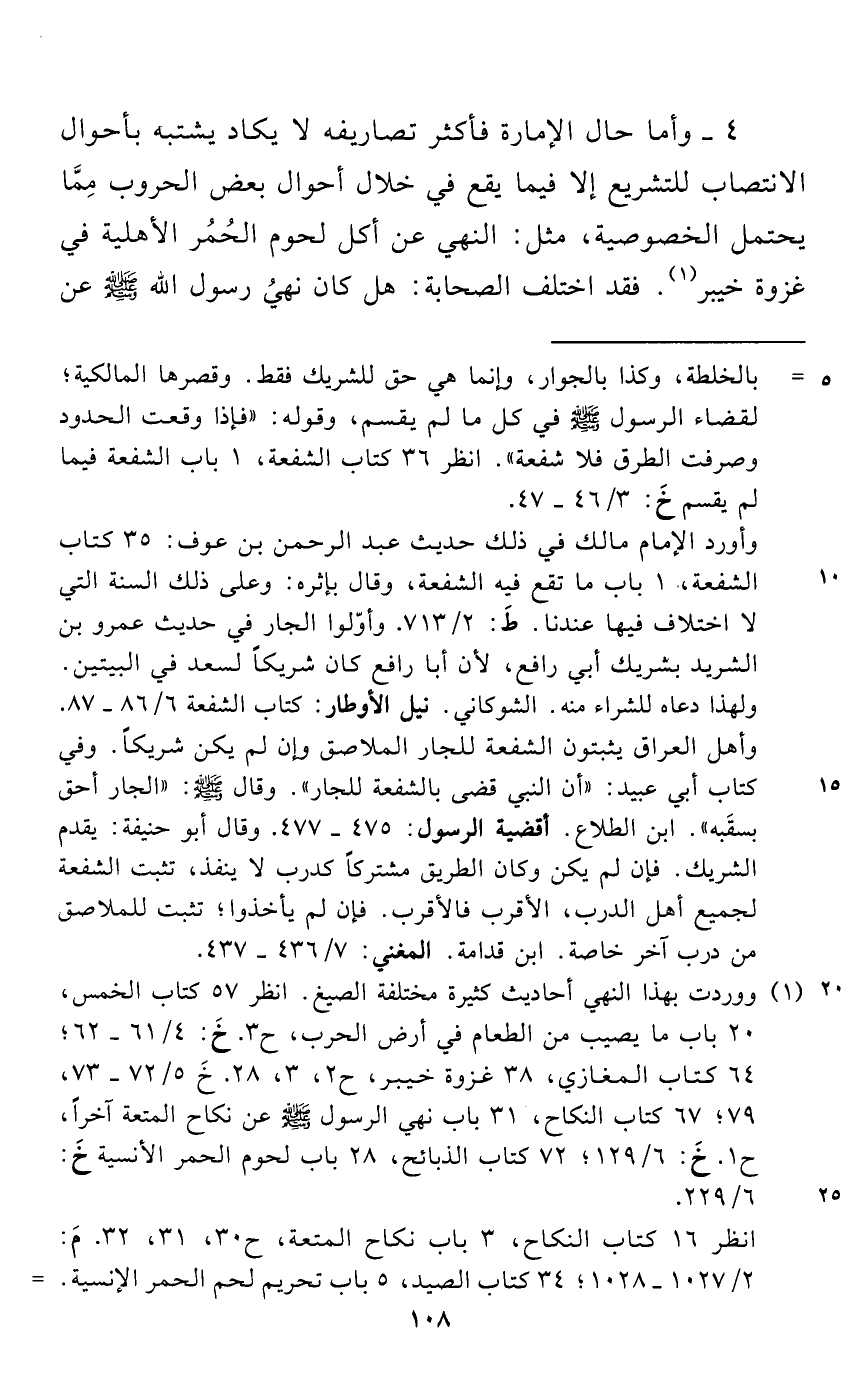 4 - وأما حال الإمارة فأكثر تصاريفه لا يكاد يشتبه بأحوال الانتصاب للتشريع إلا فيما يقع في خلال أحوال بعض الحروب مِمَّا يحتمل الخصوصية، مثل: النهي عن أكل لحوم الحُمُر الأهلية في غزوة خيبر (¬1). فقد اختلف الصحابة: هل كان نهيُ رسول الله - صلى الله عليه وسلم - عن