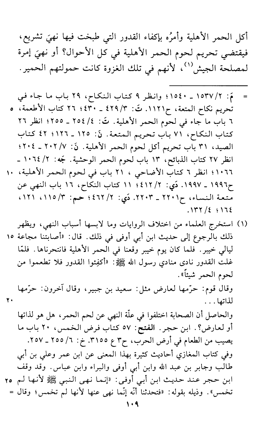 والحاصل أن الصحابة اختلفوا في علّة النهي عن لحم الحمر، هل هو لذاتها أو لعارض؟. ابن حجر. الفتح: 57 كتاب فرض الخمس، 20 باب ما يصيب، من الطعام في أرض الحرب، ح 3 ع 3155. خ: 6/ 255 - 257.