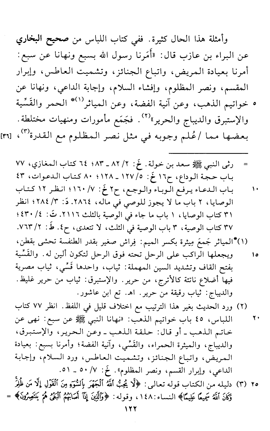 (¬2) ورد الحديث بغير هذا الترتيب مع اختلاف قليل في اللفظ. انظر 77 كتاب اللباس، 45 باب خواتيم الذهب: "نهانا النبي - صلى الله عليه وسلم - عن سبع: نهى عن خاتم الذهب - أو قال: حلقة الذهب - وعن الحرير، والإستبرق، والديباج، والميثرة الحمراء، والقَسِّي، وآنية الفضة؛ وأمرنا بسبع: بعيادة المريض، واتباع الجنائز، وتشميت العاطس، ورد السلام، وإجابة الداعي، وإبرار القسم، ونصر المظلوم". خَ: 7/ 50 - 51.