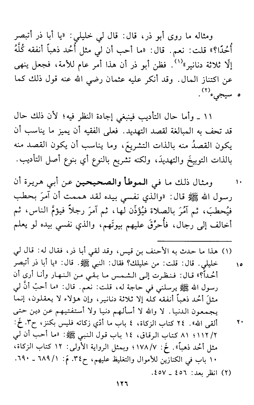 (¬1) هذا ما حدث به الأحنف بن قيس، وقد لقي أبا ذر، فقال له: قال لي خليلي. قال: قلت: من خليلك؟ فقال: النبي - صلى الله عليه وسلم -. قال: "يا أبا ذر أتبصر أحُداً؟ " قال: فنظرت إلى الشمس ما بقي من النهار وأنا أرى أن رسول الله - صلى الله عليه وسلم - يرسلني في حاجة له، قلت: نعم. قال: "ما أحبّ أنَّ لي مثلَ أحُد ذهباً أنفقه كله إلا ثلاثة دنانير، وإن هؤلاء لا يعقلون، إنما يجمعون الدنيا. لا والله لا أسألهم دنيا ولا أستفتيهم عن دين حتى ألقى الله". 24 كتاب الزكاة، 4 باب ما أدّي زكاته فليس بكنز، ح 3. خَ: 2/ 112؛ 81 كتاب الرقاق، 14 باب قول النبي - صلى الله عليه وسلم -: "ما أحب أن لي مثل أحُد ذهباً". خَ: 7/ 178؛ وبمثل الرواية الأولى: 12 كتاب الزكاة، 10 باب في الكنازين للأموال والتغليظ عليهم، ح 34. مَ: 1/ 689 - 690.