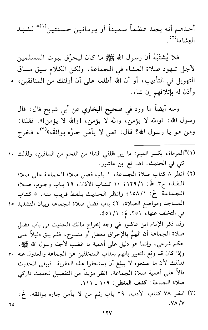 وقد ذكر الإمام ابن عاشور في وجه إخراج مالك الحديث في باب فضل صلاة الجماعة أن الهمَّ بالإحراق معطل أو منسوخ، فلم يبق دليلاً على حكم شرعي، وإنما هو دليل على أهمية ما غضب لأجله رسول الله - صلى الله عليه وسلم -. وإذا كان قد وقع التعبير بالهم بعقاب المتخلفين عن الجماعة والعدول عنه فلذلك لأن ما صنعوه لا يبلغ أن يستحقوا هذه العقوبة. فيبقى الحديث دالاً على أهمية صلاة الجماعة. انظر مزيداً من التفصيل لحديث تاركي صلاة الجماعة: كشف المغطى: 109 - 111.
