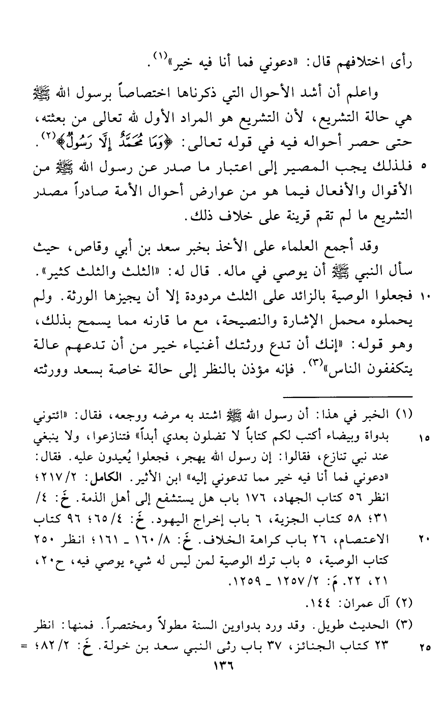 وقد أجمع العلماء على الأخذ بخبر سعد بن أبي وقاص، حيث سأل النبي - صلى الله عليه وسلم - أن يوصي في ماله. قال له: "الثلث والثلث كثير". فجعلوا الوصية بالزائد على الثلث مردودة إلا أن يجيزها الورثة. ولم يحملوه محمل الإشارة والنصيحة، مع ما قارنه مما يسمح بذلك، وهو قوله: "إنك أن تدع ورثتك أغنياء خير من أن تدعهم عالة يتكففون الناس" (¬3). فإنه مؤذن بالنظر إلى حالة خاصة بسعد وورثته