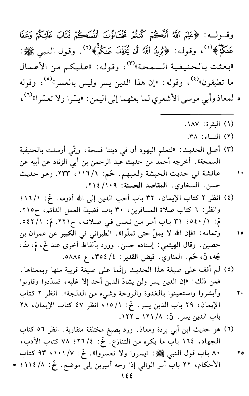 (¬4) انظر 2 كتاب الإيمان، 32 باب أحب الدين إلى الله أدومه. خَ: 1/ 16؛ وانظر: 6 كتاب صلاة المسافرين، 30 باب فضيلة العمل الدائم، ح 215. مَ: 1/ 540؛ 31 باب أمر من نعس في صلاته، ح 221. مَ: 1/ 542. وتمامه: "فإن الله لا يملّ حتى تملّوا". الطبراني في الكبير عن عمران بن حصين. وقال الهيثمي: إسناده حسن. وورد بألفاظ أخرى عند خَ، مَ، تَ، جَه، نَ، حَم. المناوي. فيض القدير: 4/ 354، ع 5885.