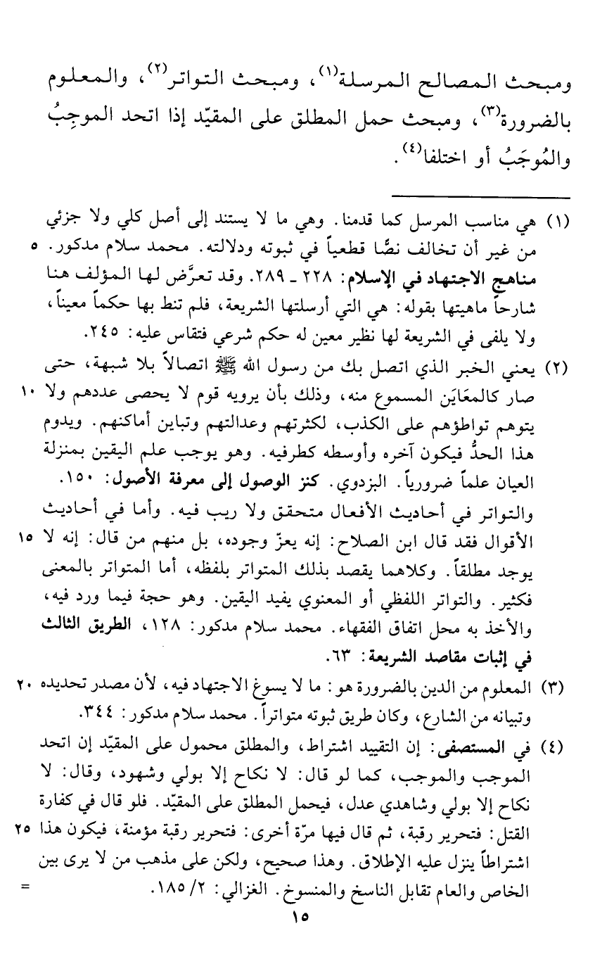 (¬3) المعلوم من الدين بالضرورة هو: ما لا يسوغ الاجتهاد فيه، لأن مصدر تحديده وتبيانه من الشارع، وكان طريق ثبوته متواتراً. محمد سلام مدكور: 344.