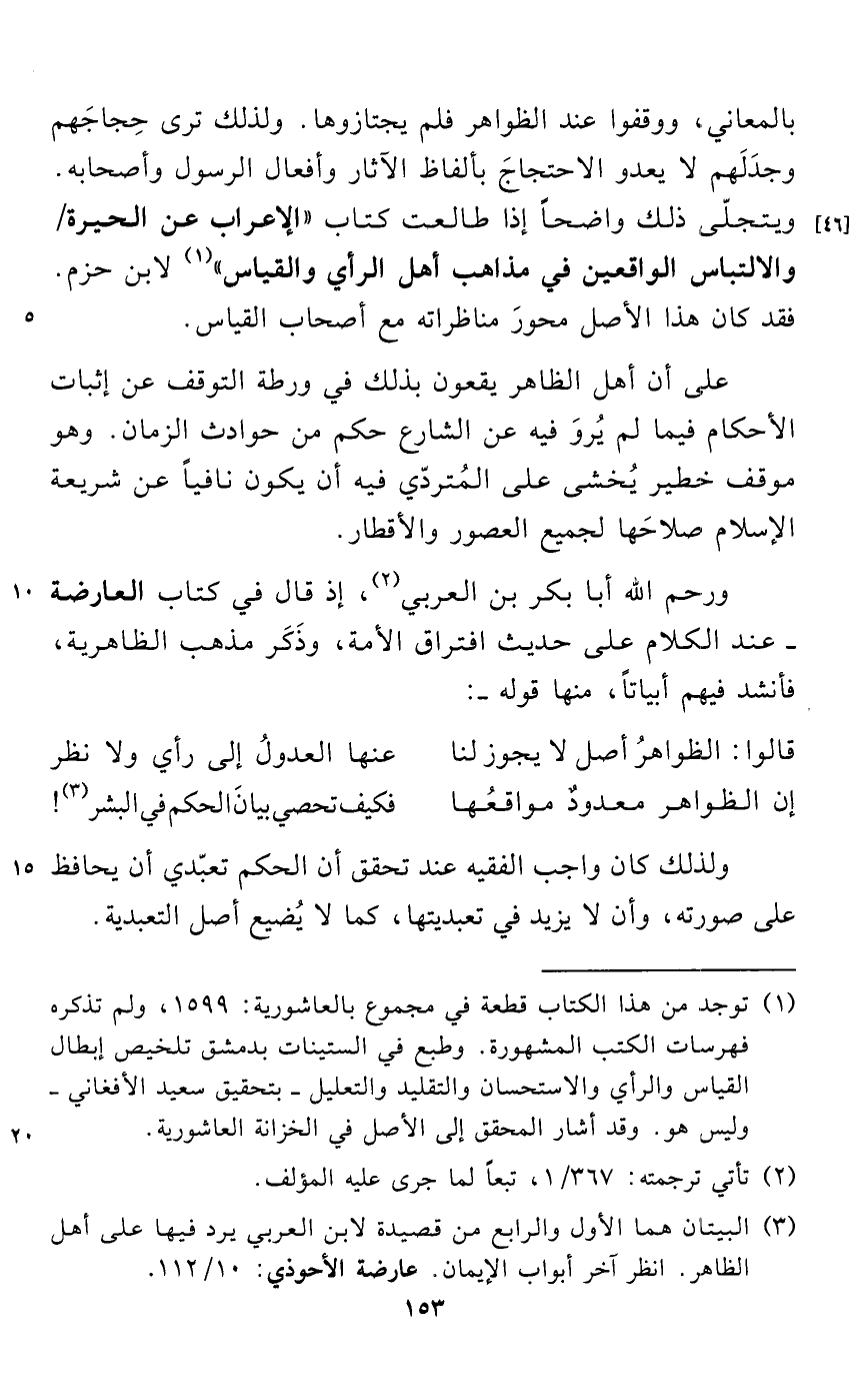 بالمعاني, ووقفوا عند الظواهر فلم يجتازوها. ولذلك ترى حِجاجَهم وجدَلَهم لا يعدو الاحتجاجَ بألفاظ الآثار وأفعال الرسول وأصحابه. ويتجلّى ذلك واضحاً إذا طالعت كتاب "الإعراب عن الحيرة والالتباس الواقعين في مذاهب أهل الرأي والقياس" (¬1) لابن حزم. فقد كان هذا الأصل محورَ مناظراته مع أصحاب القياس.