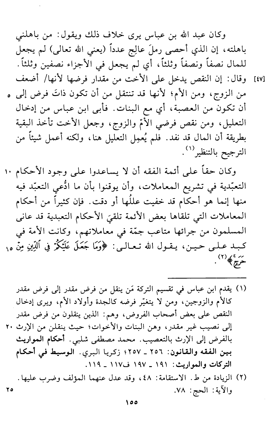 وكان حقاً على أئمة الفقه أن لا يساعدوا على وجود الأحكام التعبّدية في تشريع المعاملات، وأن يوقنوا بأن ما ادُّعي التعبّد فيه منها إنما هو أحكام قد خفيت عللُها أو دقت. فإن كثيراً من أحكام المعاملات التي تلقاها بعض الأئمة تلقيَ الأحكام التعبدية قد عانى المسلمون من جرائها متاعب جمّة في معاملاتهم، وكانت الأمة في كبد على حين، يقول الله تعالى: {وَمَا جَعَلَ عَلَيْكُمْ فِي الدِّينِ مِنْ حَرَجٍ} (¬2).