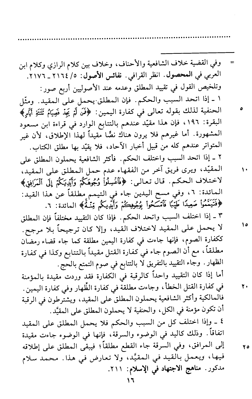 4 - وإذا اختلف كل من السبب والحكم فلا يحمل المطلق على المقيد اتفاقاً. وذلك كاليد في الوضوء والسرقة، فإنها في الوضوء جاءت مقيدة إلى المرافق، وفي السرقة جاء القطع مطلقاً؛ فيبقى المطلق على إطلاقه فيها، ويعمل بالقيد في المقيَّد، ولا تعارض في هذا. محمد سلام مدكور. مناهج الاجتهاد في الإسلام: 211.