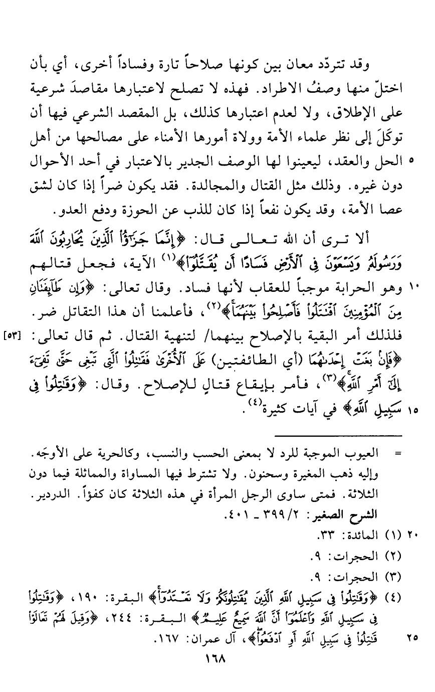 ألا ترى أن الله تعالى قال: {إِنَّمَا جَزَاءُ الَّذِينَ يُحَارِبُونَ اللَّهَ وَرَسُولَهُ وَيَسْعَوْنَ فِي الْأَرْضِ فَسَادًا أَنْ يُقَتَّلُوا} (¬1) الآية، فجعل قتالهم وهو الحرابة موجباً للعقاب لأنها فساد. وقال تعالى: {وَإِنْ طَائِفَتَانِ مِنَ الْمُؤْمِنِينَ اقْتَتَلُوا فَأَصْلِحُوا بَيْنَهُمَا} (¬2)، فأعلمنا أن هذا التقاتل ضر. فلذلك أمر البقية بالإصلاح بينهما لتنهية القتال. ثم قال تعالى: {فَإِنْ بَغَتْ إِحْدَاهُمَا (أي الطائفتين) عَلَى الْأُخْرَى فَقَاتِلُوا الَّتِي تَبْغِي حَتَّى تَفِيءَ إِلَى أَمْرِ اللَّهِ} (¬3)، فأمر بإيقاع قتالٍ للإصلاح. وقال: {وَقَاتِلُوا فِي سَبِيلِ اللَّهِ} في آيات كثيرة (¬4).