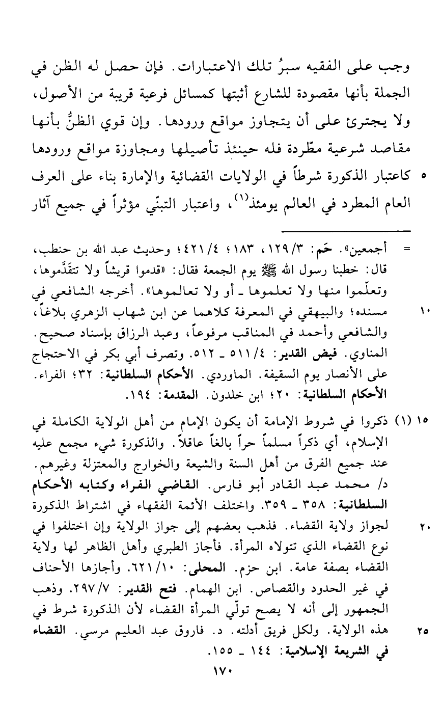 (¬1) ذكروا في شروط الإمامة أن يكون الإمام من أهل الولاية الكاملة في الإسلام، أي ذكراً مسلماً حراً بالغاً عاقلاً. والذكورة شيء مجمع عليه عند جميع الفرق من أهل السنة والشيعة والخوارج والمعتزلة وغيرهم. د/ محمد عبد القادر أبو فارس. القاضي الفراء وكتابه الأحكام السلطانية: 358 - 359. واختلف الأئمة الفقهاء في اشتراط الذكورة لجواز ولاية القضاء. فذهب بعضهم إلى جواز الولاية وإن اختلفوا في نوع القضاء الذي تتولاه المرأة. فأجاز الطبري وأهل الظاهر لها ولاية القضاء بصفة عامة. ابن حزم. المحلى: 10/ 621. وأجازها الأحناف في غير الحدود والقصاص. ابن الهمام. فتح القدير: 7/ 297. وذهب الجمهور إلى أنه لا يصح تولّي المرأة القضاء لأن الذكورة شرط في هذه الولاية. ولكل فريق أدلته. د. فاروق عبد العليم مرسي. القضاء في الشريعة الإسلامية: 144 - 155.