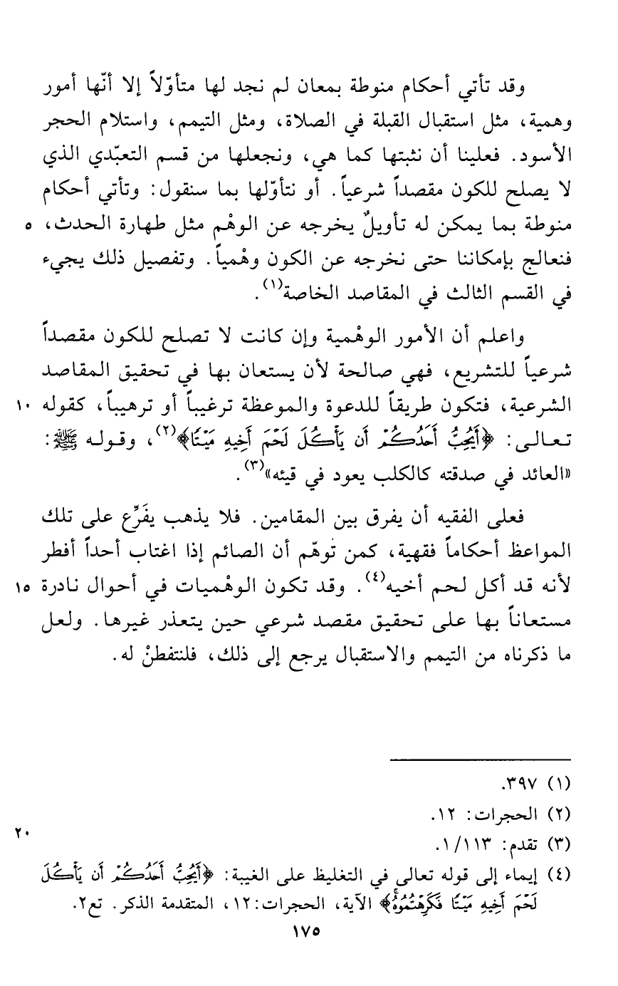 فعلى الفقيه أن يفرق بين المقامين. فلا يذهب يفَرِّع على تلك المواعظ أحكاماً فقهية، كمن توهّم أن الصائم إذا اغتاب أحداً أفطر لأنه قد أكل لحم أخيه (¬4). وقد تكون الوهْميات في أحوال نادرة مستعاناً بها على تحقيق مقصد شرعي حين يتعذر غيرها. ولعل ما ذكرناه من التيمم والاستقبال يرجع إلى ذلك، فلنتفطنْ له.