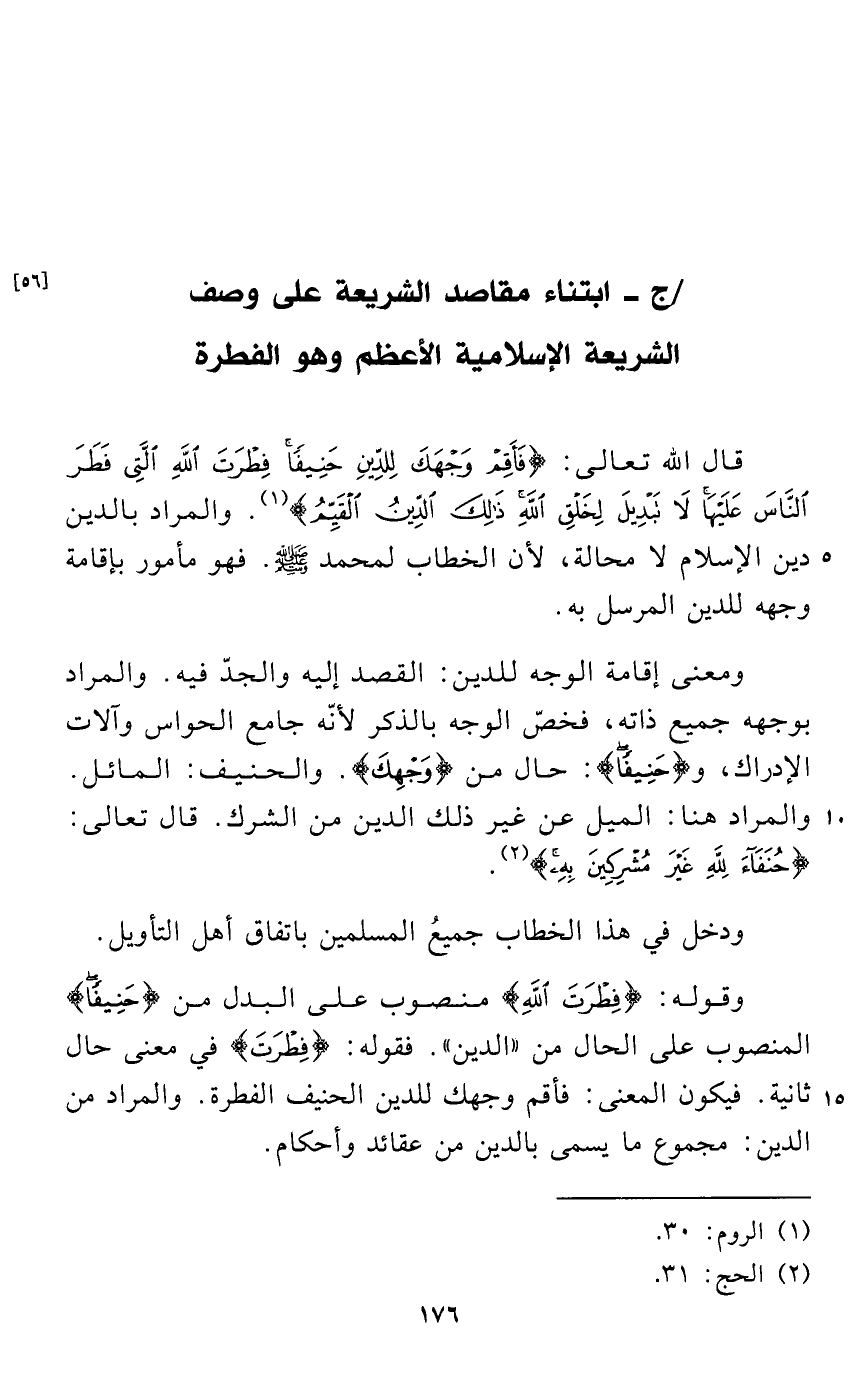 قال الله تعالى: {فَأَقِمْ وَجْهَكَ لِلدِّينِ حَنِيفًا فِطْرَتَ اللَّهِ الَّتِي فَطَرَ النَّاسَ عَلَيْهَا لَا تَبْدِيلَ لِخَلْقِ اللَّهِ ذَلِكَ الدِّينُ الْقَيِّمُ} (¬1). والمراد بالدين دين الإسلام لا محالة، لأن الخطاب لمحمد - صلى الله عليه وسلم -. فهو مأمور بإقامة وجهه للدين المرسل به.