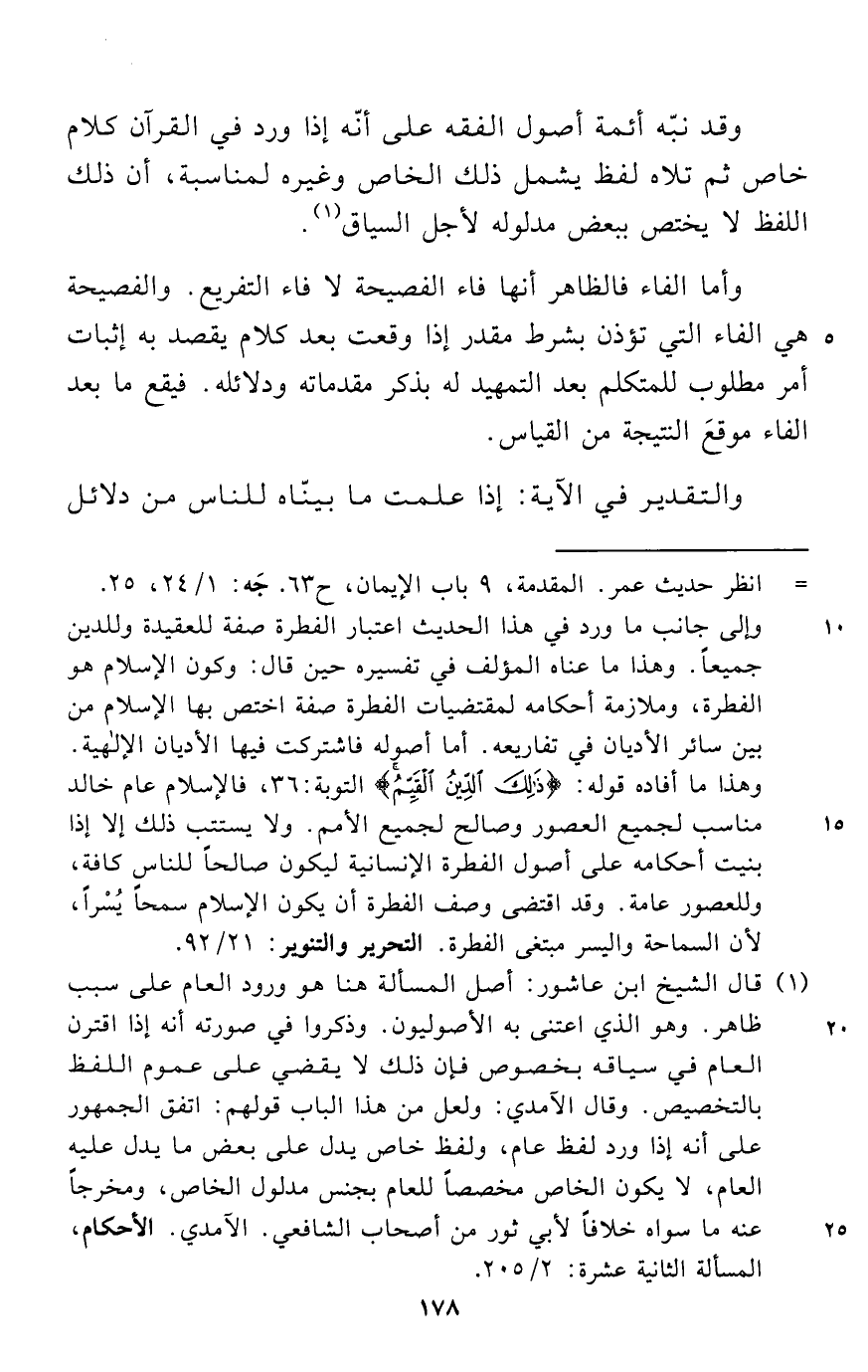 (¬1) قال الشيخ ابن عاشور: أصل المسألة هنا هو ورود العام على سبب ظاهر. وهو الذي اعتنى به الأصوليون. وذكروا في صورته أنه إذا اقترن العام في سياقه بخصوص فإن ذلك لا يقضي على عموم اللفظ بالتخصيص. وقال الآمدي: ولعل من هذا الباب قولهم: اتفق الجمهور على أنه إذا ورد لفظ عام، ولفظ خاص يدل على بعض ما يدل عليه العام، لا يكون الخاص مخصصاً للعام بجنس مدلول الخاص، ومخرجاً عنه ما سواه خلافاً لأبي ثور من أصحاب الشافعي. الآمدي. الأحكام، المسألة الثانية عشرة: 2/ 205.