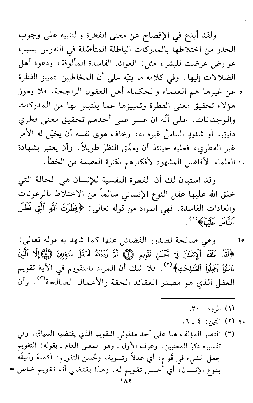 ولقد أبدع في الإفصاح عن معنى الفطرة والتنبيه على وجوب الحذر من اختلاطها بالمدركات الباطلة المتأصّلة في النفوس بسبب عوارض عرضت للبشر، مثل: العوائد الفاسدة المألوفة، ودعوة أهل الضلالات إليها. وفي كلامه ما ينبّه على أن المخاطبين بتمييز الفطرة عن غيرها هم العلماء والحكماء أهل العقول الراجحة، فلا يعوز هؤلاء تحقيق معنى الفطرة وتمييزها عما يلتبس بها من المدركات والوجدانات. على أنّه إن عسر على أحدهم تحقيق معنى فطري دقيق، أو شديدٍ التباسُ غيره به، وخاف هوى نفسه أن يخيّل له الأمر غير الفطري، فعليه حينئذ أن يعمِّق النظرَ طويلاً، وأن يعتبر بشهادة العلماء الأفاضل المشهود لأفكارهم بكثرة العصمة من الخطأ.