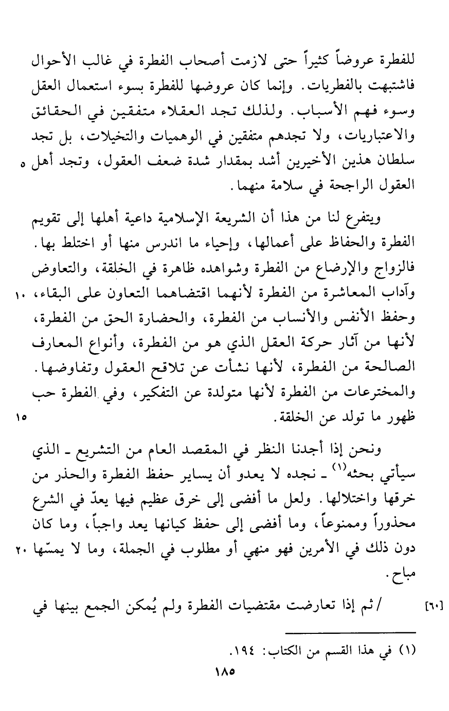 للفطرة عروضاً كثيراً حتى لازمت أصحاب الفطرة في غالب الأحوال فاشتبهت بالفطريات. وإنما كان عروضها للفطرة بسوء استعمال العقل وسوء فهم الأسباب. ولذلك تجد العقلاء متفقين في الحقائق والاعتباريات، ولا تجدهم متفقين في الوهميات والتخيلات، بل تجد سلطان هذين الأخيرين أشد بمقدار شدة ضعف العقول، وتجد أهل العقول الراجحة في سلامة منهما.