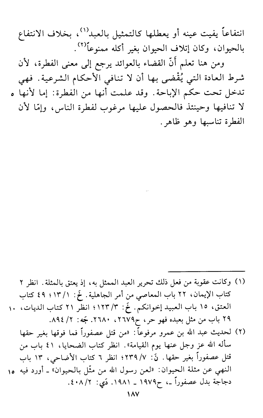 (¬2) لحديث عبد الله بن عمرو مرفوعاً: "من قتل عصفوراً فما فوقها بغير حقها سأله الله عز وجل عنها يوم القيامة". انظر كتاب الضحايا، 41 باب من قتل عصفوراً بغير حقها. نَ: 7/ 239؛ انظر 6 كتاب الأضاحي، 13 باب النهي عن مثلة الحيوان: "لعن رسول الله من مثّل بالحيوان" - أورد فيه دجاجة بدل عصفوراً -، ح 1979 - 1981. دَي: 2/ 408.