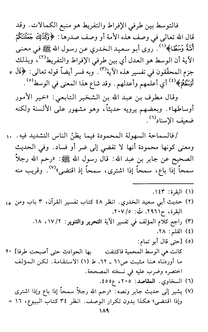 فالتوسط بين طرفي الإفراط والتفريط هو منبع الكمالات. وقد قال الله تعالى في وصف هذه الأمة أو وصف صدرها: {وَكَذَلِكَ جَعَلْنَاكُمْ أُمَّةً وَسَطًا} (¬1). روى أبو سعيد الخدري عن رسول الله - صلى الله عليه وسلم - في معنى الآية أن الوسط هو العدل أي بين طرفي الإفراط والتفريط (¬2)، وبذلك جزم المحقّقون في تفسير هذه الآية (¬3). وبه فسر أيضاً قوله تعالى: {قَالَ أَوْسَطُهُمْ} (¬4) أي أعلمهم وأعدلهم. وقد شاع هذا المعنى في الوسط (¬5).