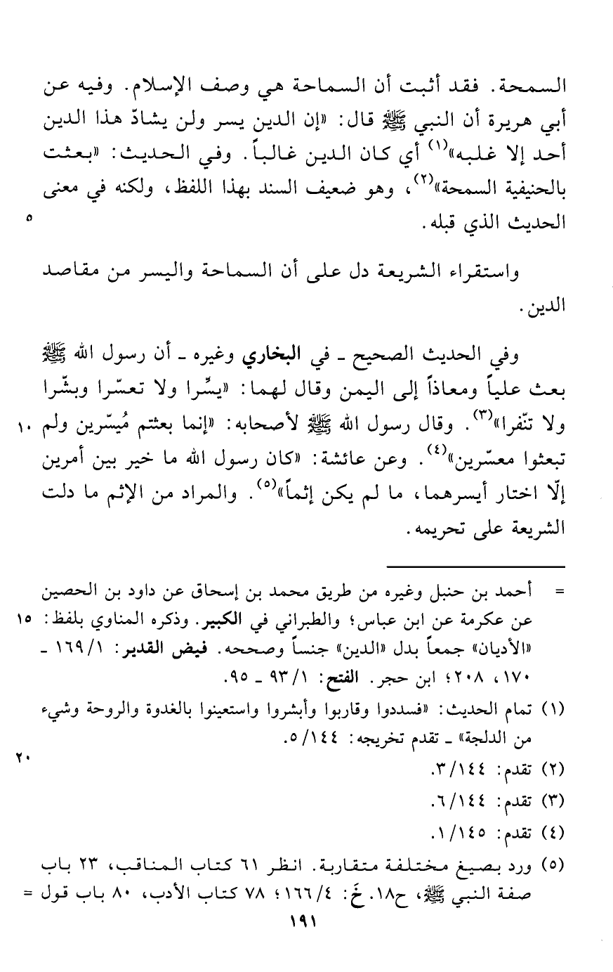 السمحة. فقد أثبت أن السماحة هي وصف الإسلام. وفيه عن أبي هريرة أن النبي - صلى الله عليه وسلم - قال: "إن الدين يسر ولن يشادّ هذا الدين أحد إلا غلبه" (¬1) أي كان الدين غالباً. وفي الحديث: "بعثت بالحنيفية السمحة" (¬2)، وهو ضعيف السند بهذا اللفظ، ولكنه في معنى الحديث الذي قبله.