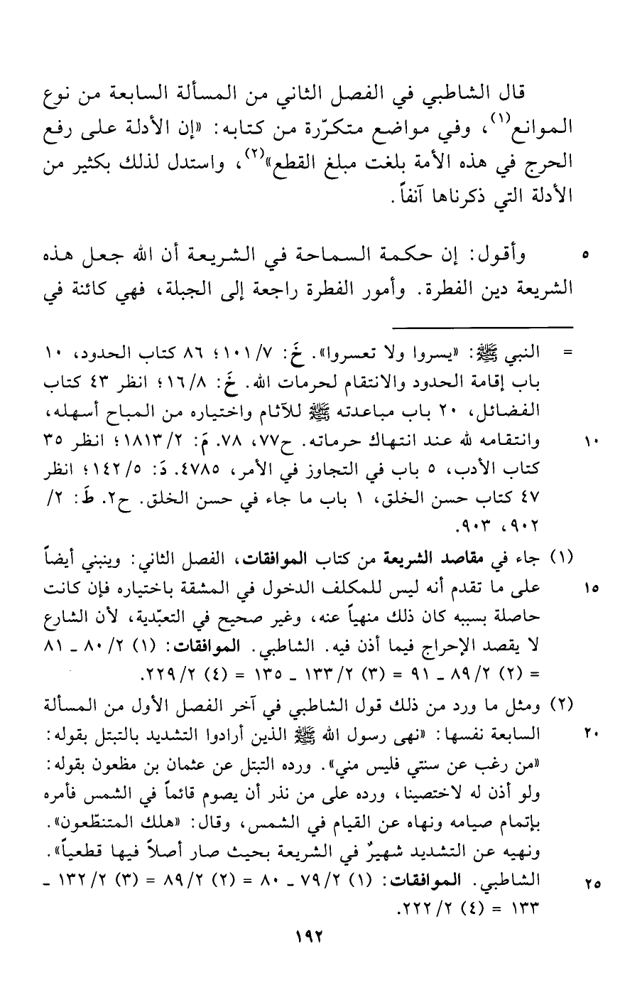 (¬2) ومثل ما ورد من ذلك قول الشاطبي في آخر الفصل الأول من المسألة السابعة نفسها: "نهى رسول الله - صلى الله عليه وسلم - الذين أرادوا التشديد بالتبتل بقوله: "من رغب عن سنتي فليس مني". ورده التبتل عن عثمان بن مظعون بقوله: ولو أذن له لاختصينا، ورده على من نذر أن يصوم قائماً في الشمس فأمره بإتمام صيامه ونهاه عن القيام في الشمس، وقال: "هلك المتنطّعون". ونهيه عن التشديد شهيرٌ في الشريعة بحيث صار أصلاً فيها قطعياً". الشاطبي. الموافقات: (1) 2/ 79 - 80 = (2) 2/ 89 = (3) 2/ 132 - 133 = (4) 2/ 222.
