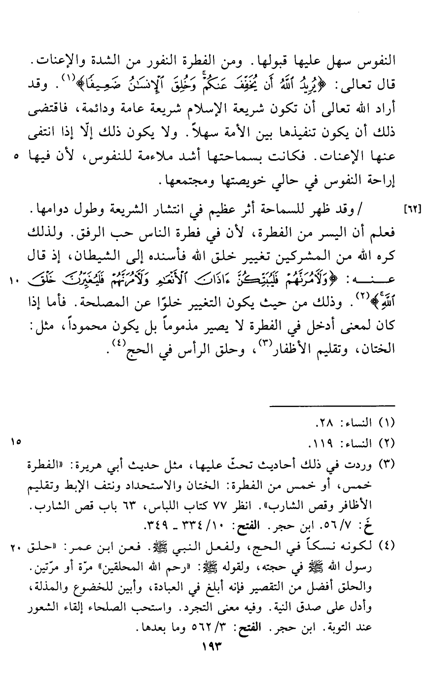 وقد ظهر للسماحة أثر عظيم في انتشار الشريعة وطول دوامها. فعلم أن اليسر من الفطرة، لأن في فطرة الناس حب الرفق. ولذلك كره الله من المشركين تغيير خلق الله فأسنده إلى الشيطان، إذ قال عنه: {وَلَآمُرَنَّهُمْ فَلَيُبَتِّكُنَّ آذَانَ الْأَنْعَامِ وَلَآمُرَنَّهُمْ فَلَيُغَيِّرُنَّ خَلْقَ اللَّهِ} (¬2). وذلك من حيث يكون التغيير خلوًا عن المصلحة. فأما إذا كان لمعنى أدخل في الفطرة لا يصير مذموماً بل يكون محموداً، مثل: الختان، وتقليم الأظفار (¬3)، وحلق الرأس في الحج (¬4).