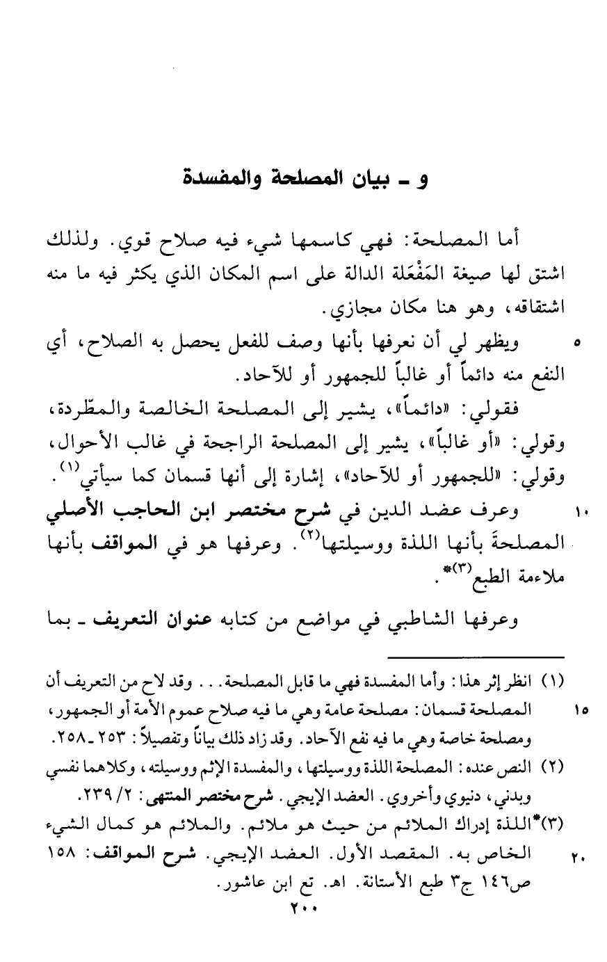 (¬2) النص عنده: المصلحة اللذة ووسيلتها، والمفسدة الإثم ووسيلته، وكلاهما نفسي وبدني، دنيوي وأخروي. العضد الإيجي. شرح مختصر المنتهى: 2/ 239.
