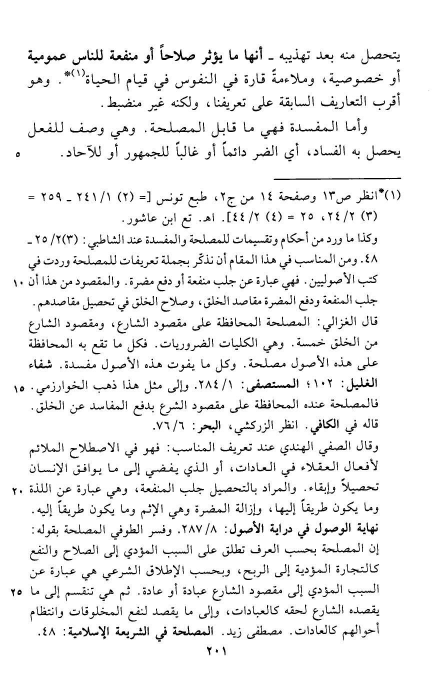 وكذا ما ورد من أحكام وتقسيمات للمصلحة والمفسدة عند الشاطبي: (3) 2/ 25 - 48. ومن المناسب في هذا المقام أن نذكّر بجملة تعريفات للمصلحة وردت في كتب الأصوليين. فهي عبارة عن جلب منفعة أو دفع مضرة. والمقصود من هذا أن جلب المنفعة ودفع المضرة مقاصد الخلق، وصلاح الخلق في تحصيل مقاصدهم. قال الغزالي: المصلحة المحافظة على مقصود الشارع، ومقصود الشارع من الخلق خمسة. وهي الكليات الضروريات. فكل ما تقع به المحافظة على هذه الأصول مصلحة. وكل ما يفوت هذه الأصول مفسدة. شفاء الغليل: 102؛ المستصفى: 1/ 284. وإلى مثل هذا ذهب الخوارزمي. فالمصلحة عنده المحافظة على مقصود الشرع بدفع المفاسد عن الخلق. قاله في الكافي. انظر الزركشي، البحر: 6/ 76.
