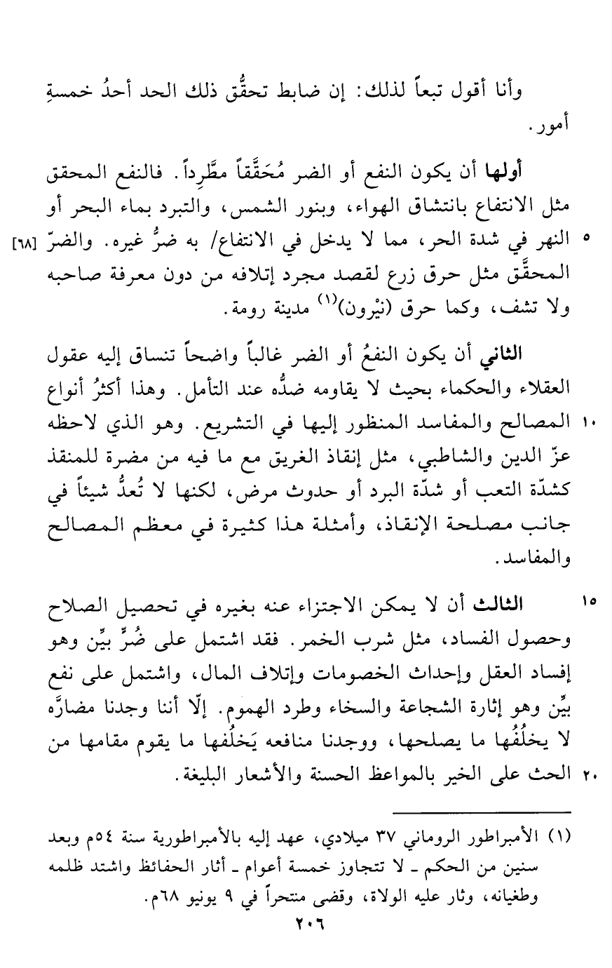 أولها أن يكون النفع أو الضر مُحَقَّقاً مطَّرِداً. فالنفع المحقق مثل الانتفاع بانتشاق الهواء، وبنور الشمس، والتبرد بماء البحر أو النهر في شدة الحر، مما لا يدخل في الانتفاع به ضرُّ غيره. والضرّ المحقَّق مثل حرق زرع لقصد مجرد إتلافه من دون معرفة صاحبه ولا تشف، وكما حرق (نيْرون) (¬1) مدينة رومة.