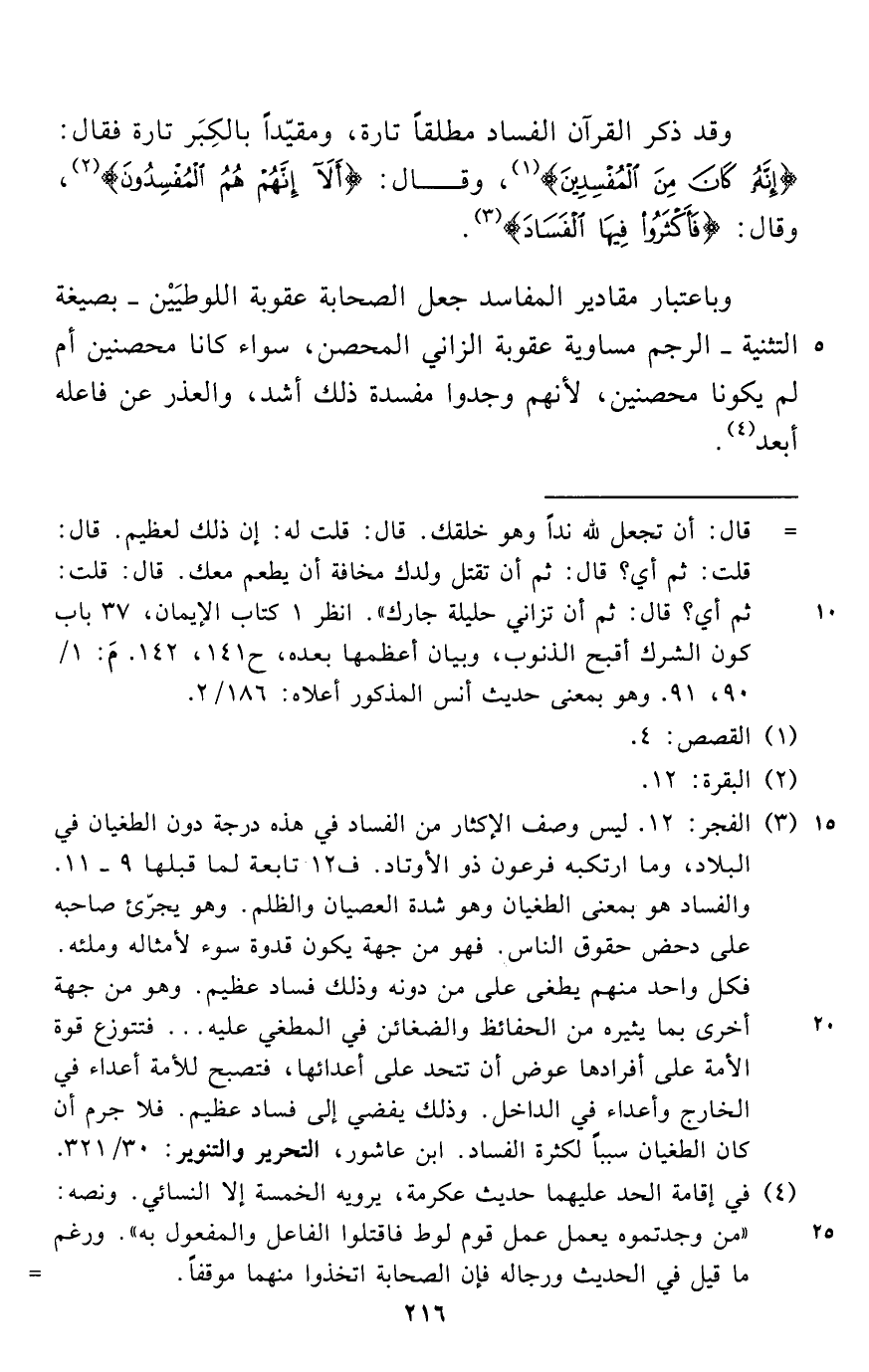 (¬3) الفجر: 12. ليس وصف الإكثار من الفساد في هذه درجة دون الطغيان في البلاد، وما ارتكبه فرعون ذو الأوتاد. ف 12 تابعة لما قبلها 9 - 11. والفساد هو بمعنى الطغيان وهو شدة العصيان والظلم. وهو يجزئ صاحبه على دحض حقوق الناس. فهو من جهة يكون قدوة سوء لأمثاله وملئه. فكل واحد منهم يطغى على من دونه وذلك فساد عظيم. وهو من جهة أخرى بما يثيره من الحفائظ والضغائن في المطغي عليه ... فتتوزع قوة الأمة على أفرادها عوض أن تتحد على أعدائها، فتصبح للأمة أعداء في الخارج وأعداء في الداخل. وذلك يفضي إلى فساد عظيم. فلا جرم أن كان الطغيان سبباً لكثرة الفساد. ابن عاشور، التحرير والتنوير: 30/ 321.