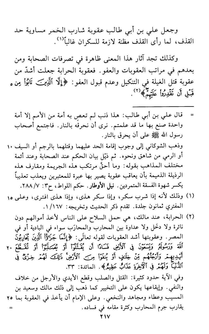 وكذلك تجد آثار هذا المعنى ظاهرة في تصرفات الصحابة ومن بعدهم في مراتب العقوبات والعفو. فعقوبة الحرابة جعلت أشدّ من عقوبة قتل الغيلة في التنكيل وعدم قبول العفو: {إِلَّا الَّذِينَ تَابُوا مِنْ قَبْلِ أَنْ تَقْدِرُوا عَلَيْهِمْ} (¬2).
