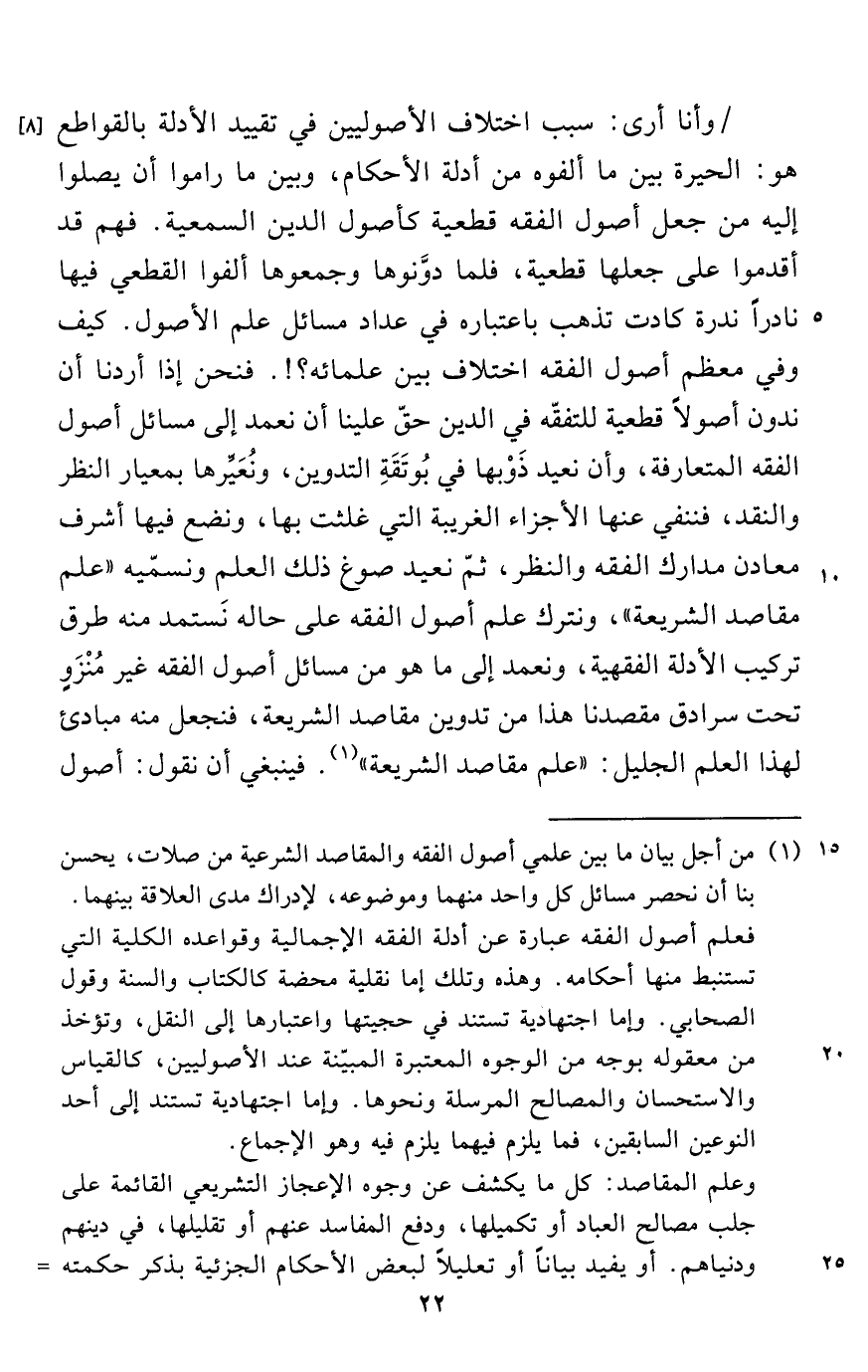 وأنا أرى: سبب اختلاف الأصوليين في تقييد الأدلة بالقواطع هو: الحيرة بين ما ألفوه من أدلة الأحكام، وبين ما راموا أن يصلوا إليه من جعل أصول الفقه قطعية كأصول الدين السمعية. فهم قد أقدموا على جعلها قطعية، فلما دوَّنوها وجمعوها ألفوا القطعي فيها نادراً ندرة كادت تذهب باعتباره في عداد مسائل علم الأصول. كيف وفي معظم أصول الفقه اختلاف بين علمائه؟!. فنحن إذا أردنا أن ندون أصولاً قطعية للتفقّه في الدين حقّ علينا أن نعمد إلى مسائل أصول الفقه المتعارفة، وأن نعيد ذَوْبها في بُوتَقَةِ التدوين، ونُعَيِّرها بمعيار النظر والنقد، فننفي عنها الأجزاء الغريبة التي غلثت بها، ونضع فيها أشرف معادن مدارك الفقه والنظر، ثمّ نعيد صوغ ذلك العلم ونسمّيه "علم مقاصد الشريعة"، ونترك علم أصول الفقه على حاله نَستمد منه طرق تركيب الأدلة الفقهية، ونعمد إلى ما هو من مسائل أصول الفقه غير مُنْزَوٍ تحت سرادق مقصدنا هذا من تدوين مقاصد الشريعة، فنجعل منه مبادئ لهذا العلم الجليل: "علم مقاصد الشريعة" (¬1). فينبغي أن نقول: أصول