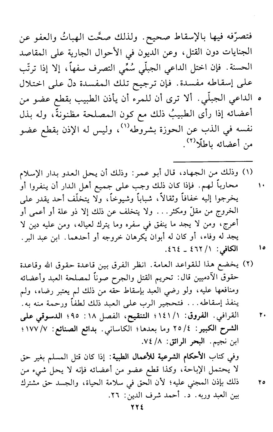(¬2) يخضع هذا للقواعد العامة. انظر الفرق بين قاعدة حقوق الله وقاعدة حقوق الآدميين قال: تحريم القتل والجرح صوناً لمصلحة العبد وأعضائه ومنافعها عليه، ولو رضي العبد بإسقاط حقه من ذلك لم يعتبر رضاه، ولم ينفذ إسقاطه ... فتحجير الرب على العبد ذلك لطفاً ورحمة منه به. القرافي. الفروق: 1/ 141؛ التنقيح، الفصل 18: 95؛ الدسوقي على الشرح الكبير: 4/ 25 وما بعدها؛ الكاساني. بدائع الصنائع: 7/ 177؛ ابن نجيم. البحر الرائق: 8/ 74.
