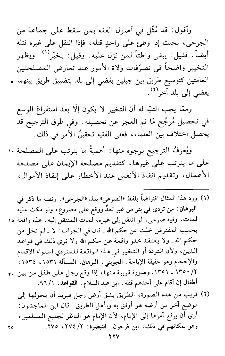 (¬1) ورد هذا المثال افتراضاً بلفظ "الصرعى" بدل "الجرحى". ونصه ما ذكر في البرهان: من تردى في بئر من غير تعدٍّ ووقع على مصروع، ولو مكث عليه لمات، وفيه صرعى، لو انتقل إلى غيره، لمات المنتقل إليه. هذه واقعة بحسب المفترض خلت عن حكم الله - قال في الجواب: لا - لم تخل من حكم الله - ولا يعتقد خلو واقعة عن حكم الله ولا نرى ذلك في قواعد الدين، ولأن التردد أو التخير في هذه الواقعة للمتردي استواء الإقدام والإحجام وهو حقيقة الإباحة. الجويني. البرهان، المسألة 1531، 1534: 2/ 1350 - 1351. وصورة قريبة منها، إذا وقع رجل على طفل من بين أطفال إن أقام على أحدهم قتله. ابن عبد السلام. القواعد: 1/ 96.