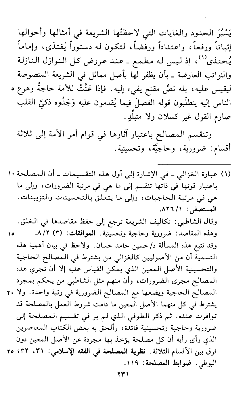(¬1) عبارة الغزالي - في الإشارة إلى أول هذه التقسيمات - أن المصلحة باعتبار قوتها في ذاتها تنقسم إلى ما هي في مرتبة الضرورات، وإلى ما هي في مرتبة الحاجيات، وإلى ما يتعلق بالتحسينات والتزيينات. المستصفى: 1/ 826.