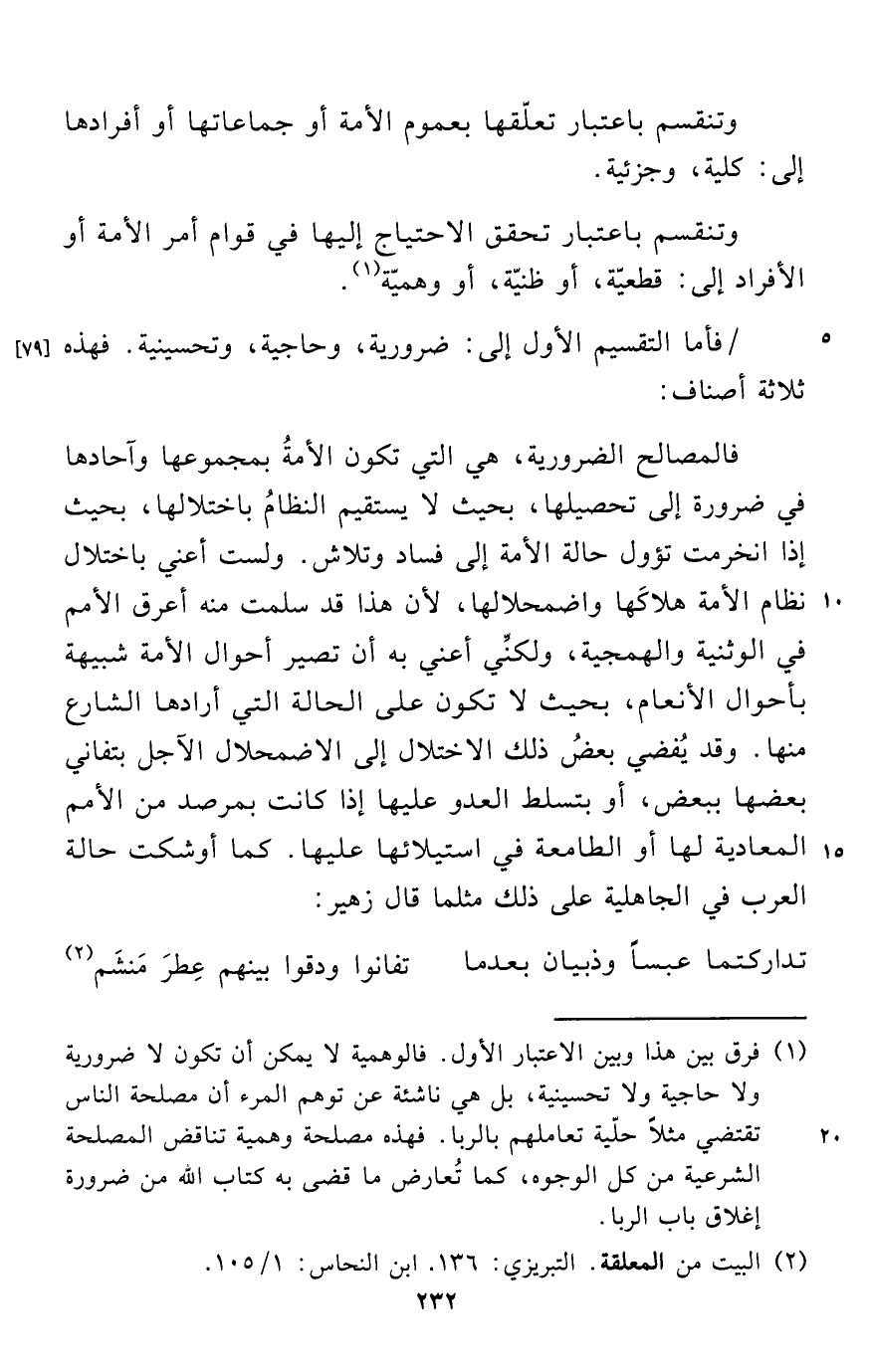 (¬1) فرق بين هذا وبين الاعتبار الأول. فالوهمية لا يمكن أن تكون لا ضرورية ولا حاجية ولا تحسينية، بل هي ناشئة عن توهم المرء أن مصلحة الناس تقتضي مثلاً حلّية تعاملهم بالربا. فهذه مصلحة وهمية تناقض المصلحة الشرعية من كل الوجوه، كما تُعارض ما قضى به كتاب الله من ضرورة إغلاق باب الربا.