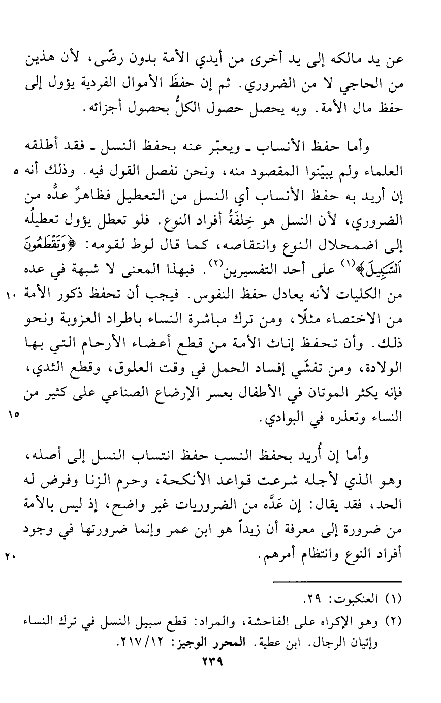 وأما حفظ الأنساب - ويعبّر عنه بحفظ النسل - فقد أطلقه العلماء ولم يبيّنوا المقصود منه، ونحن نفصل القول فيه. وذلك أنه إن أريد به حفظ الأنساب أي النسل من التعطيل فظاهرٌ عدُّه من الضروري، لأن النسل هو خِلفَةُ أفراد النوع. فلو تعطل يؤول تعطيلُه إلى اضمحلال النوع وانتقاصه، كما قال لوط لقومه: {وَتَقْطَعُونَ السَّبِيلَ} (¬1) على أحد التفسيرين (¬2). فبهذا المعنى لا شبهة في عده من الكليات لأنه يعادل حفظ النفوس. فيجب أن تحفظ ذكور الأمة من الاختصاء مثلًا، ومن ترك مباشرة النساء باطراد العزوبة ونحو ذلك. وأن تحفظ إناث الأمة من قطع أعضاء الأرحام التي بها الولادة، ومن تفشّي إفساد الحمل في وقت العلوق، وقطع الثدي، فإنه يكثر الموتان في الأطفال بعسر الإرضاع الصناعي على كثير من النساء وتعذره في البوادي.