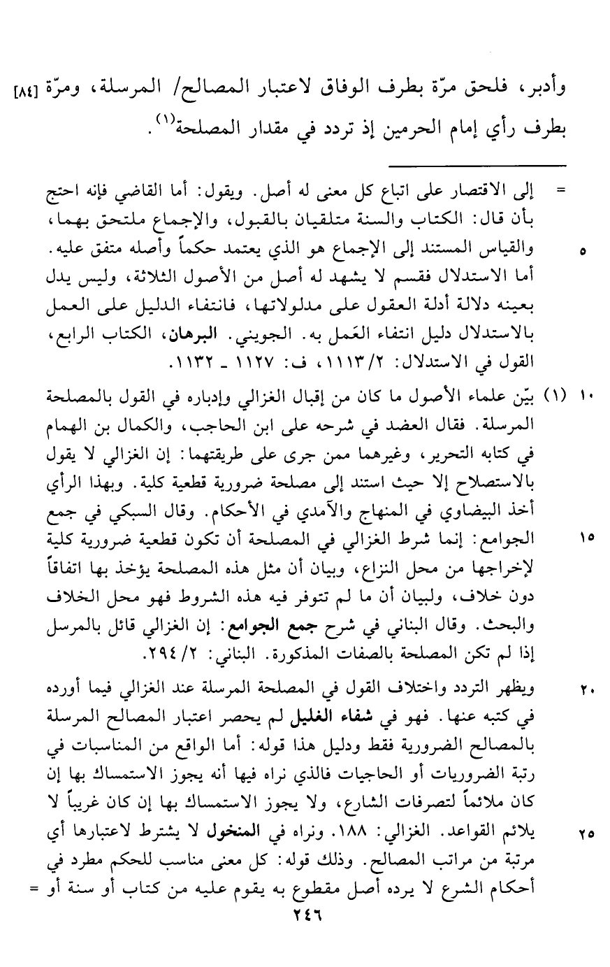 (¬1) بيّن علماء الأصول ما كان من إقبال الغزالي وإدباره في القول بالمصلحة المرسلة. فقال العضد في شرحه على ابن الحاجب، والكمال بن الهمام في كتابه التحرير، وغيرهما ممن جرى على طريقتهما: إن الغزالي لا يقول بالاستصلاح إلا حيث استند إلى مصلحة ضرورية قطعية كلية. وبهذا الرأي أخذ البيضاوي في المنهاج والآمدي في الأحكام. وقال السبكي في جمع الجوامع: إنما شرط الغزالي في المصلحة أن تكون قطعية ضرورية كلية لإخراجها من محل النزاع، وبيان أن مثل هذه المصلحة يؤخذ بها اتفاقاً دون خلاف، ولبيان أن ما لم تتوفر فيه هذه الشروط فهو محل الخلاف والبحث. وقال البناني في شرح جمع الجوامع: إن الغزالي قائل بالمرسل إذا لم تكن المصلحة بالصفات المذكورة. البناني: 2/ 294.