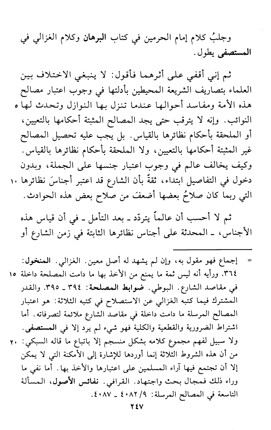ثم إني أقفي على أثرهما فأقول: لا ينبغي الاختلاف بين العلماء بتصاريف الشريعة المحيطين بأدلتها في وجوب اعتبار مصالح هذه الأمة ومفاسد أحوالها عندما تنزل بها النوازل وتحدث لها النوائب. وإنه لا يترقب حتى يجد المصالح المثبتة أحكامها بالتعيين، أو الملحقة بأحكام نظائرها بالقياس. بل يجب عليه تحصيل المصالح غير المثبتة أحكامها بالتعيين، ولا الملحقة بأحكام نظائرها بالقياس. وكيف يخالف عالم في وجوب اعتبار جنسها على الجملة، وبدون دخول في التفاصيل ابتداء، ثقةً بأن الشارع قد اعتبر أجناسَ نظائرها التي ربما كان صلاحُ بعضها أضعفَ من صلاح بعض هذه الحوادث.