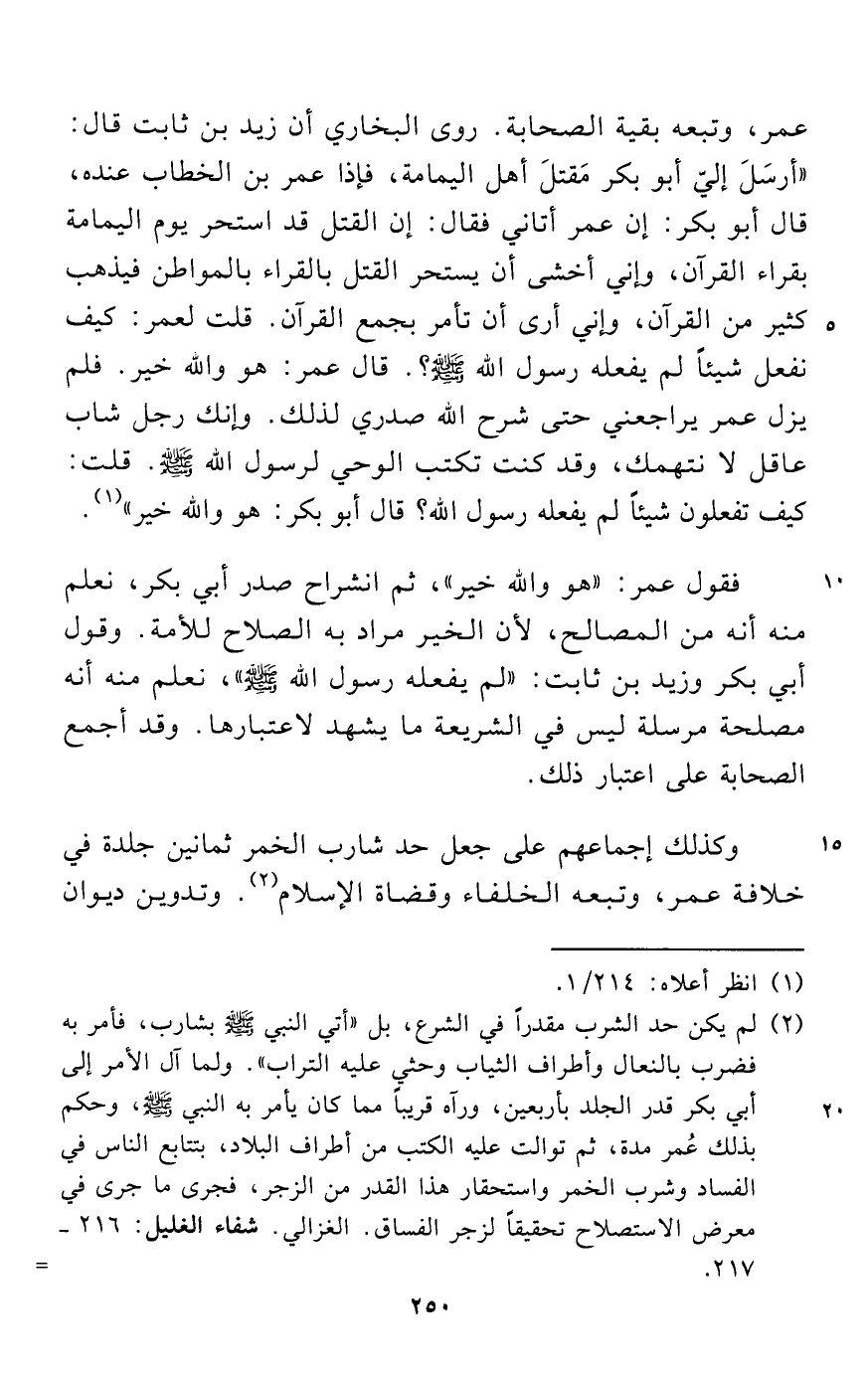 (¬2) لم يكن حد الشرب مقدراً في الشرع، بل "أتي النبي - صلى الله عليه وسلم - بشارب، فأمر به فضرب بالنعال وأطراف الثياب وحثي عليه التراب". ولما آل الأمر إلى أبي بكر قدر الجلد بأربعين، ورآه قريباً مما كان يأمر به النبي - صلى الله عليه وسلم -، وحكم بذلك عُمر مدة، ثم توالت عليه الكتب من أطراف البلاد، بتتابع الناس في الفساد وشرب الخمر واستحقار هذا القدر من الزجر، فجرى ما جرى في معرض الاستصلاح تحقيقاً لزجر الفساق. الغزالي. شفاء الغليل: 216 - 217. =