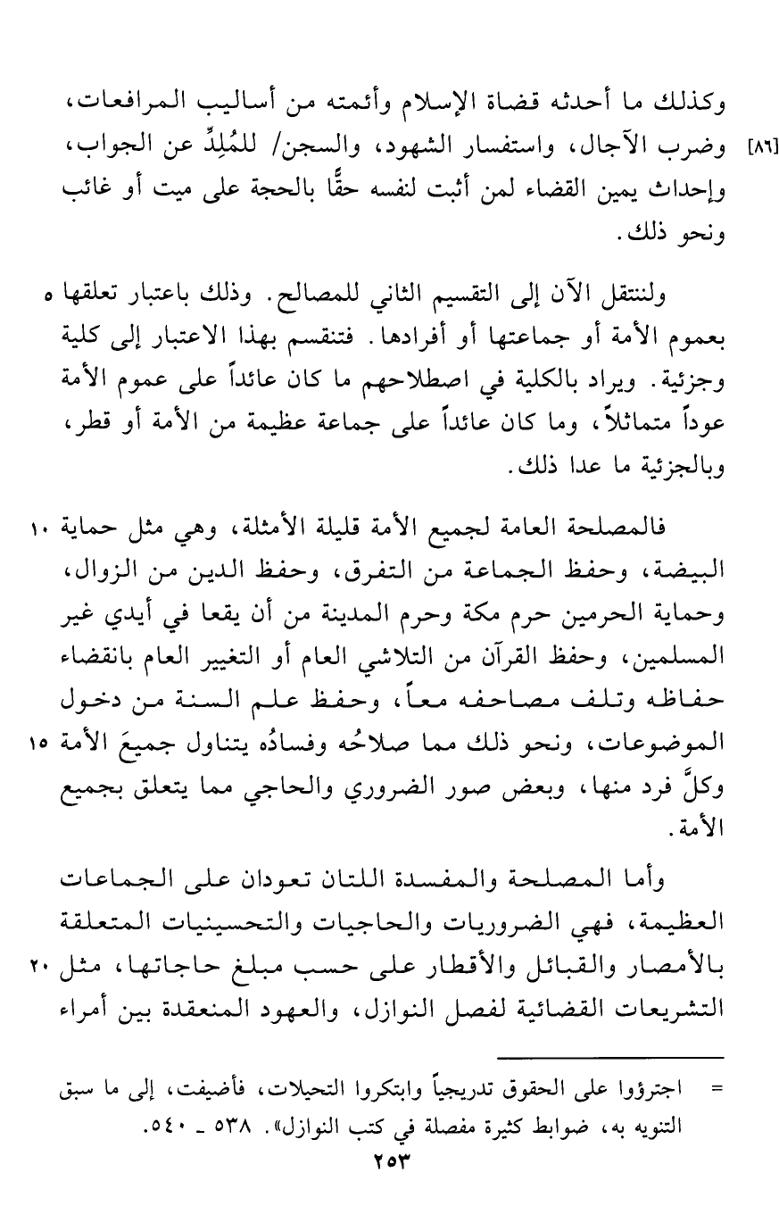 وأما المصلحة والمفسدة اللتان تعودان على الجماعات العظيمة، فهي الضروريات والحاجيات والتحسينيات المتعلقة بالأمصار والقبائل والأقطار على حسب مبلغ حاجاتها، مثل التشريعات القضائية لفصل النوازل، والعهود المنعقدة بين أمراء