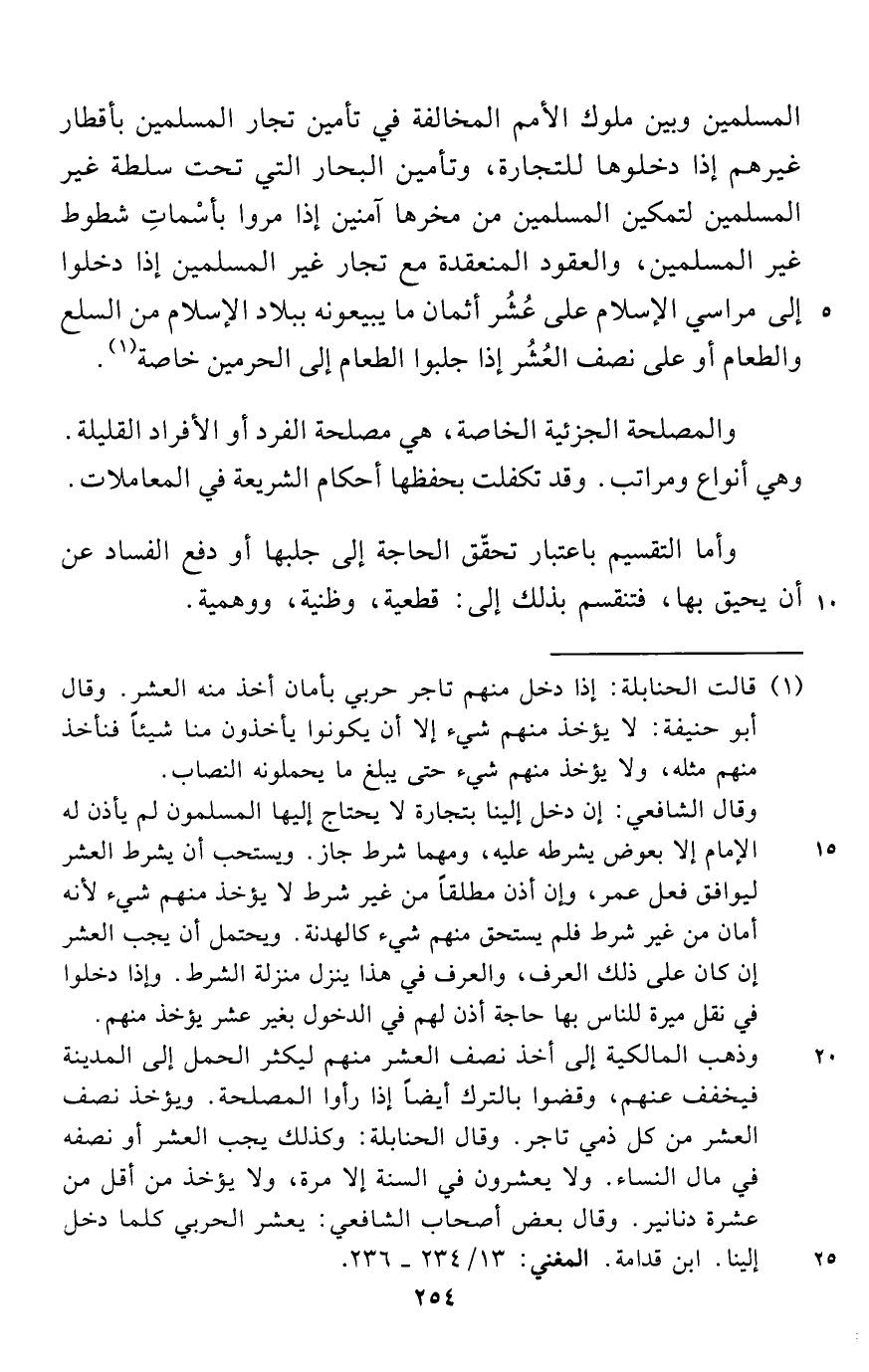 المسلمين وبين ملوك الأمم المخالفة في تأمين تجار المسلمين بأقطار غيرهم إذا دخلوها للتجارة، وتأمين البحار التي تحت سلطة غير المسلمين لتمكين المسلمين من مخرها آمنين إذا مروا بأسْماتِ شطوط غير المسلمين، والعقود المنعقدة مع تجار غير المسلمين إذا دخلوا إلى مراسي الإسلام على عُشُر أثمان ما يبيعونه ببلاد الإسلام من السلع والطعام أو على نصف العُشُر إذا جلبوا الطعام إلى الحرمين خاصة (¬1).