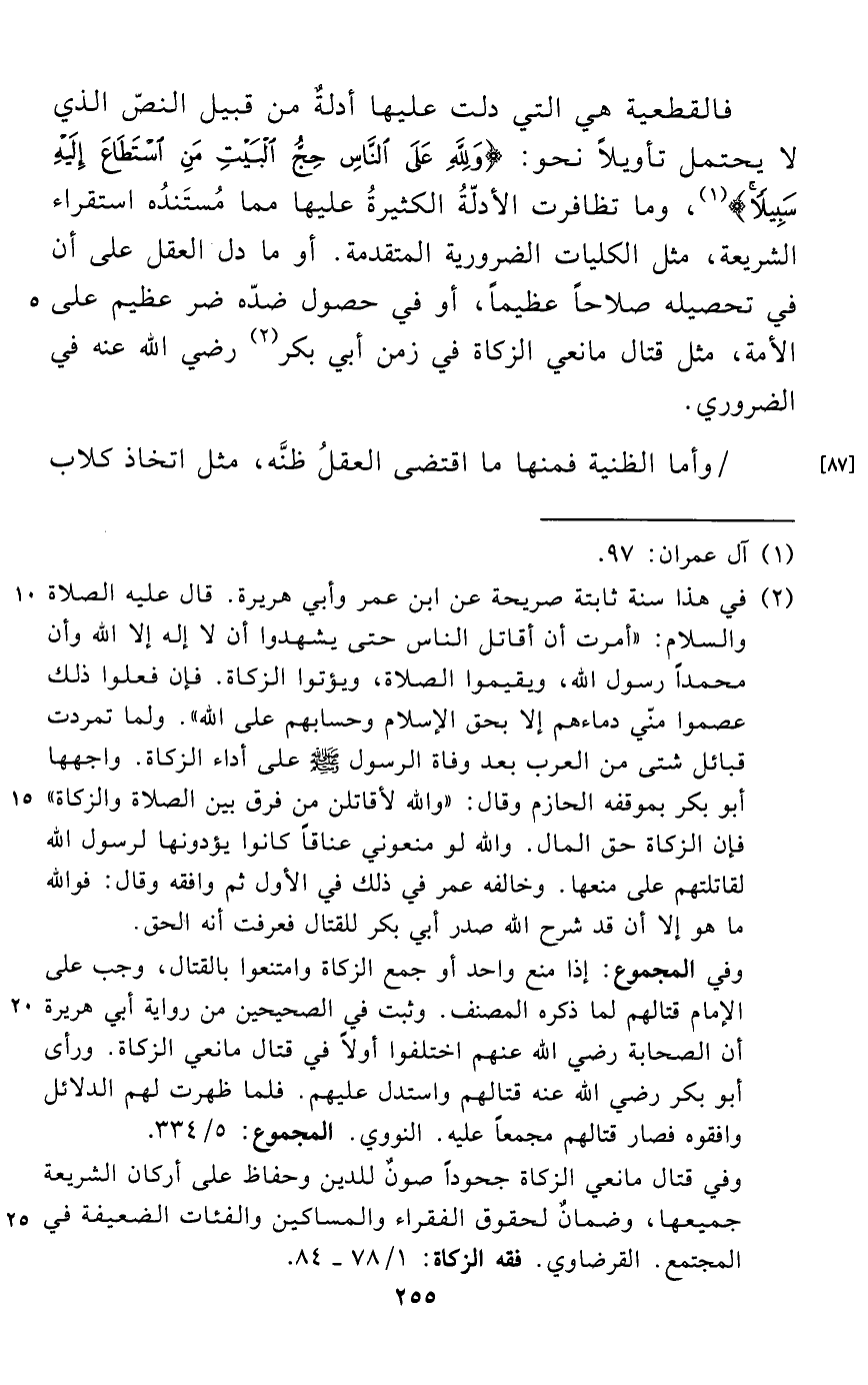 فالقطعية هي التي دلت عليها أدلةٌ من قبيل النصّ الذي لا يحتمل تأويلاً نحو: {وَلِلَّهِ عَلَى النَّاسِ حِجُّ الْبَيْتِ مَنِ اسْتَطَاعَ إِلَيْهِ سَبِيلًا} (¬1)، وما تظافرت الأدلّةُ الكثيرةُ عليها مما مُستَندُه استقراء الشريعة، مثل الكليات الضرورية المتقدمة. أو ما دل العقل على أن في تحصيله صلاحاً عظيماً، أو في حصول ضدّه ضر عظيم على الأمة، مثل قتال مانعي الزكاة في زمن أبي بكر (¬2) رضي الله عنه في الضروري.