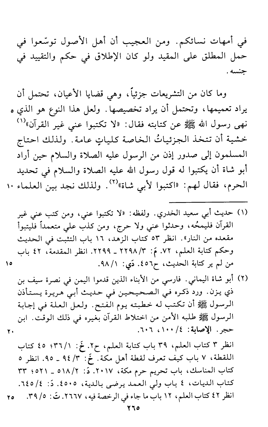 وما كان من التشريعات جزئياً، وهي قضايا الأعيان، تحتمل أن يراد تعميمها، وتحتمل أن يراد تخصيصها. ولعل هذا النوع هو الذي نهى رسول الله - صلى الله عليه وسلم - عن كتابته فقال: "لا تكتبوا عني غير القرآن" (¬1) خشية أن تتخذ الجزئياتُ الخاصة كلياتٍ عامة. ولذلك احتاج المسلمون إلى صدور إذن من الرسول عليه الصلاة والسلام حين أراد أبو شاة أن يكتبوا له قول رسول الله عليه الصلاة والسلام في تحديد الحرم، فقال لهم: "اكتبوا لأبي شاة" (¬2). ولذلك نجد بين العلماء