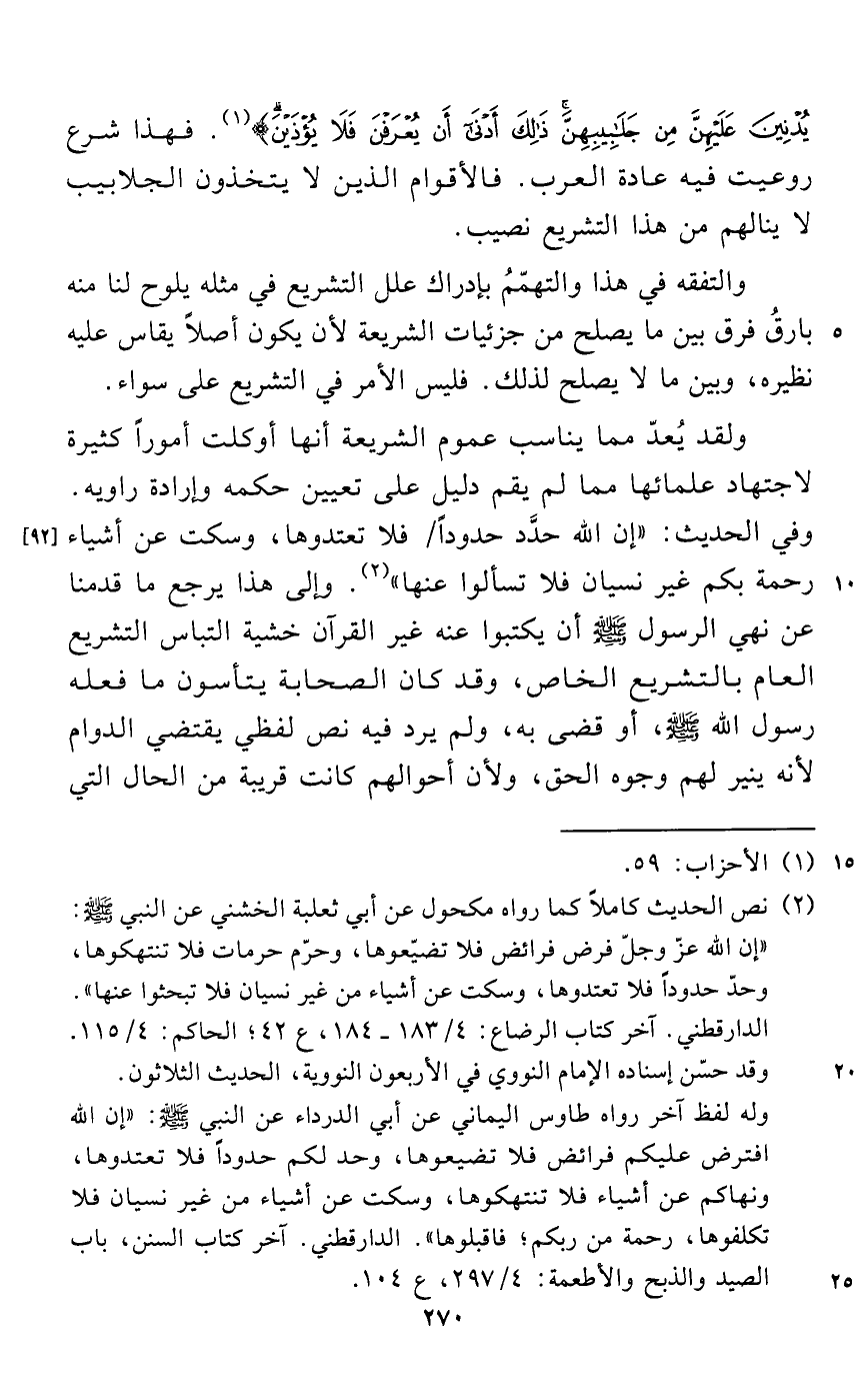 (¬2) نص الحديث كاملاً كما رواه مكحول عن أبي ثعلبة الخشني عن النبي - صلى الله عليه وسلم -: "إن الله عزّ وجلّ فرض فرائض فلا تضيّعوها، وحرّم حرمات فلا تنتهكوها، وحدّ حدوداً فلا تعتدوها، وسكت عن أشياء من غير نسيان فلا تبحثوا عنها". الدارقطني. آخر كتاب الرضاع: 4/ 183 - 184، ع 42؛ الحاكم: 4/ 115. وقد حسّن إسناده الإمام النووي في الأربعون النووية، الحديث الثلاثون.