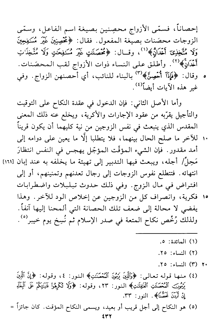 وأما الأصل الثاني: فإن الدخول في عقدة النكاح على التوقيت والتأجيل يقرّبه من عقود الإجارات والأكرية، ويخلع عنه ذلك المعنى المقدس الذي ينبعث في نفس الزوجين من نية كليهما أن يكون قريناً للآخر ما صلح الحال بينهما، فلا يتطلبا إلَّا ما يعين على دوامه إلى أمد مقدور. فإن الشيء المؤقّت المؤجل يهجس في النفس انتظارَ مَحِلِّ أجله، ويبعث فيها التدبير إلى تهيئة ما يخلفه به عند إبان انتهائه. فتتطلع نفوس الزوجات إلى رجال تعدنهم وتمنينهم، أو إلى افتراض في مال الزوج. وفي ذلك حدوث تبلبلات واضطرابات فكرية، وانصراف كل من الزوجين عن إخلاص الود للآخر. وهذا يفضي لا محالة إلى ضعف تلك الحصانة التي ألمحنا إليها آنفاً. ولذلك رُخِّص نكاح المتعة في صدر الإِسلام ثم نُسِخ يوم خيبر (¬5).