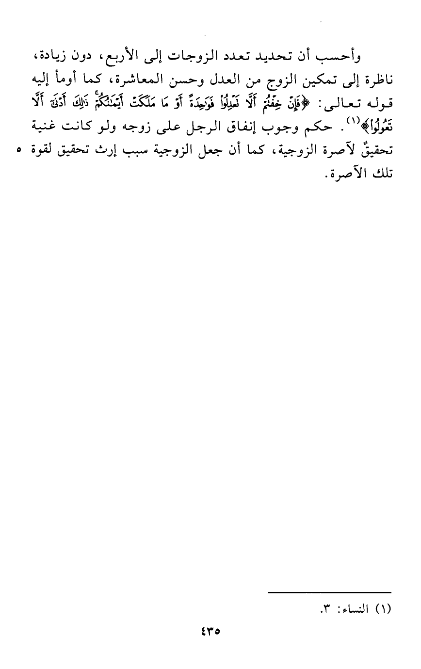 وأحسب أن تحديد تعدد الزوجات إلى الأربع، دون زيادة، ناظرة إلى تمكين الزوج من العدل وحسن المعاشرة، كما أومأ إليه قوله تعالى: {فَإِنْ خِفْتُمْ أَلَّا تَعْدِلُوا فَوَاحِدَةً أَوْ مَا مَلَكَتْ أَيْمَانُكُمْ ذَلِكَ أَدْنَى أَلَّا تَعُولُوا} (¬1). حكم وجوب إنفاق الرجل على زوجه ولو كانت غنية تحقيقٌ لآصرة الزوجية، كما أن جعل الزوجية سبب إرث تحقيق لقوة تلك الآصرة.