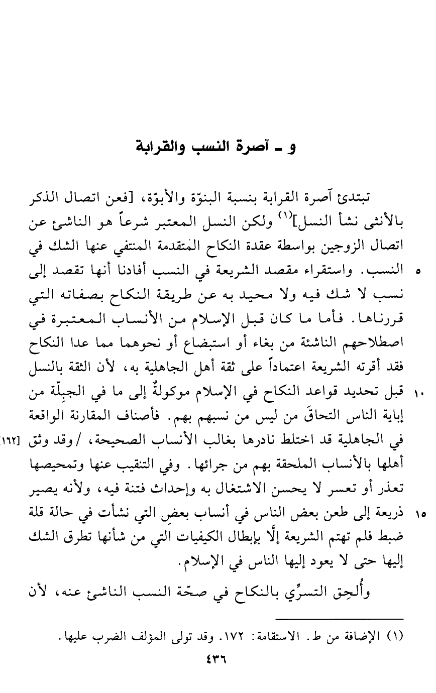 تبتدئ آصرة القرابة بنسبة البنوّة والأبوّة، [فعن اتصال الذكر بالأنثى نشأ النسل] (¬1) ولكن النسل المعتبر شرعاً هو الناشئ عن اتصال الزوجين بواسطة عقدة النكاح المتقدمة المنتفي عنها الشك في النسب. واستقراء مقصد الشريعة في النسب أفادنا أنها تقصد إلى نسب لا شك فيه ولا محيد به عن طريقة النكاح بصفاته التي قررناها. فأما ما كان قبل الإِسلام من الأنساب المعتبرة في اصطلاحهم الناشئة من بغاء أو استبضاع أو نحوهما مما عدا النكاح فقد أقرته الشريعة اعتماداً على ثقة أهل الجاهلية به, لأن الثقة بالنسل قبل تحديد قواعد النكاح في الإسلام موكولةٌ إلى ما في الجبِلّة من إباية الناس التحاقَ من ليس من نسبهم بهم. فأصناف المقارنة الواقعة في الجاهلية قد اختلط نادرها بغالب الأنساب الصحيحة, وقد وثق أهلها بالأنساب الملحقة بهم من جرائها. وفي التنقيب عنها وتمحيصها تعذر أو تعسر لا يحسن الاشتغال به وإحداث فتنة فيه، ولأنه يصير ذريعة إلى طعن بعض الناس في أنساب بعضِ التي نشأت في حالة قلة ضبط فلم تهتم الشريعة إلَّا بإبطال الكيفيات التي من شأنها تطرق الشك إليها حتى لا يعود إليها الناس في الإسلام.