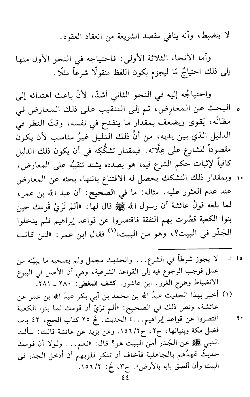 واحتياجُه إليه في النحو الثاني أشدّ، لأنّ باعث اهتدائه إلى البحث عن المعارِض، ثم إلى التنقيب على ذلك المعارض في مظانّه، يَقوى ويضعف بمقدار ما ينقدح في نفسه، وقتَ النظر في الدليل الذي بين يديه، من أنَّ ذلك الدليل غيرُ مناسب لأن يكون مقصوداً للشارع على عِلَّاته. فبمقدار تشكُّكِه في أن يكون ذلك الدليل كافياً لإثبات حكم الشرع فيما هو بصدده يشتد تنقيبُه على المعارض، وبمقدار ذلك التشكك يحصل له الاقتناع بانتهاء بحثه عن المعارض عند عدم العثور عليه. مثاله: ما في الصحيح: أن عبد الله بن عمر، لما بلغه قولُ عائشة أن رسول الله - صلى الله عليه وسلم - قال لها: "ألمْ تَرَيْ قَومك حين بنوا الكعبة قصُرت بهم النفقة فاقتصروا عن قواعد إبراهيم فلم يدخلوا الجَدْر في البيت؟، وهو من البيت" (¬1) فقال ابن عمر: "لئن كانت