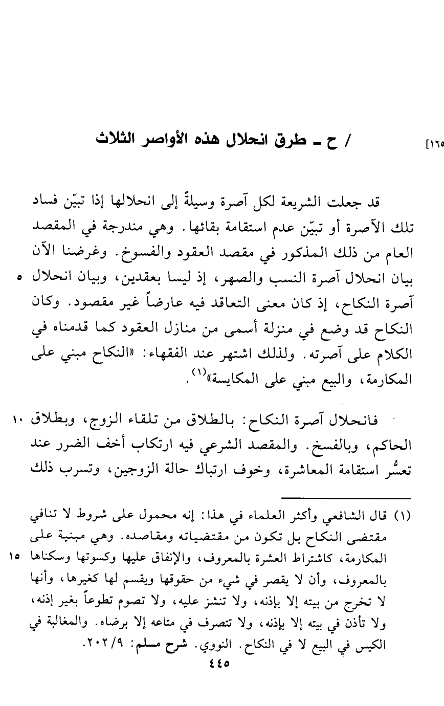 قد جعلت الشريعة لكل آصرة وسيلةً إلى انحلالها إذا تبيّن فساد تلك الآصرة أو تبيّن عدم استقامة بقائها. وهي مندرجة في المقصد العام من ذلك المذكور في مقصد العقود والفسوخ. وغرضنا الآن بيان انحلال آصرة النسب والصهر، إذ ليسا بعقدين، وبيان انحلال آصرة النكاح، إذ كان معنى التعاقد فيه عارضاً غير مقصود. وكان النكاح قد وضع في منزلة أسمى من منازل العقود كما قدمناه في الكلام على آصرته. ولذلك اشتهر عند الفقهاء: "النكاح مبني على المكارمة، والبيع مبني على المكايسة" (¬1).