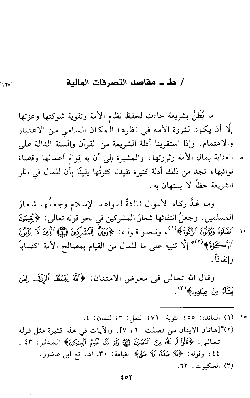 ما يُظَنُّ بشريعة جاءت لحفظ نظام الأمة وتقوية شوكتها وعزتها إلَّا أن يكون لثروة الأمة في نظرها المكان السامي من الاعتبار والاهتمام. وإذا استقرينا أدلة الشريعة من القرآن والسنة الدالة على العناية بمال الأمة وثروتها، والمشيرة إلى أن به قِوامَ أعمالها وقضاءَ نوائبها، نجد من ذلك أدلة كثيرة تفيدنا كثرتُها يقينًا بأن للمال في نظر الشريعة حظاً لا يستهان به.