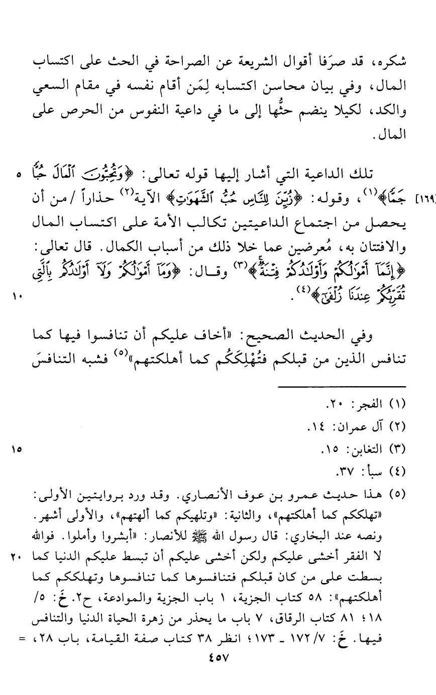 تلك الداعية التي أشار إليها قوله تعالى: {وَتُحِبُّونَ الْمَالَ حُبًّا جَمًّا} (¬1)، وقوله: {زُيِّنَ لِلنَّاسِ حُبُّ الشَّهَوَاتِ} الآية (¬2) حذاراً من أن يحصل من اجتماع الداعيتين تكالب الأمة على اكتساب المال والافتتان به، مُعرضين عما خلا ذلك من أسباب الكمال. قال تعالى: {إِنَّمَا أَمْوَالُكُمْ وَأَوْلَادُكُمْ فِتْنَةٌ} (¬3) وقال: {وَمَا أَمْوَالُكُمْ وَلَا أَوْلَادُكُمْ بِالَّتِي تُقَرِّبُكُمْ عِنْدَنَا زُلْفَى} (¬4).