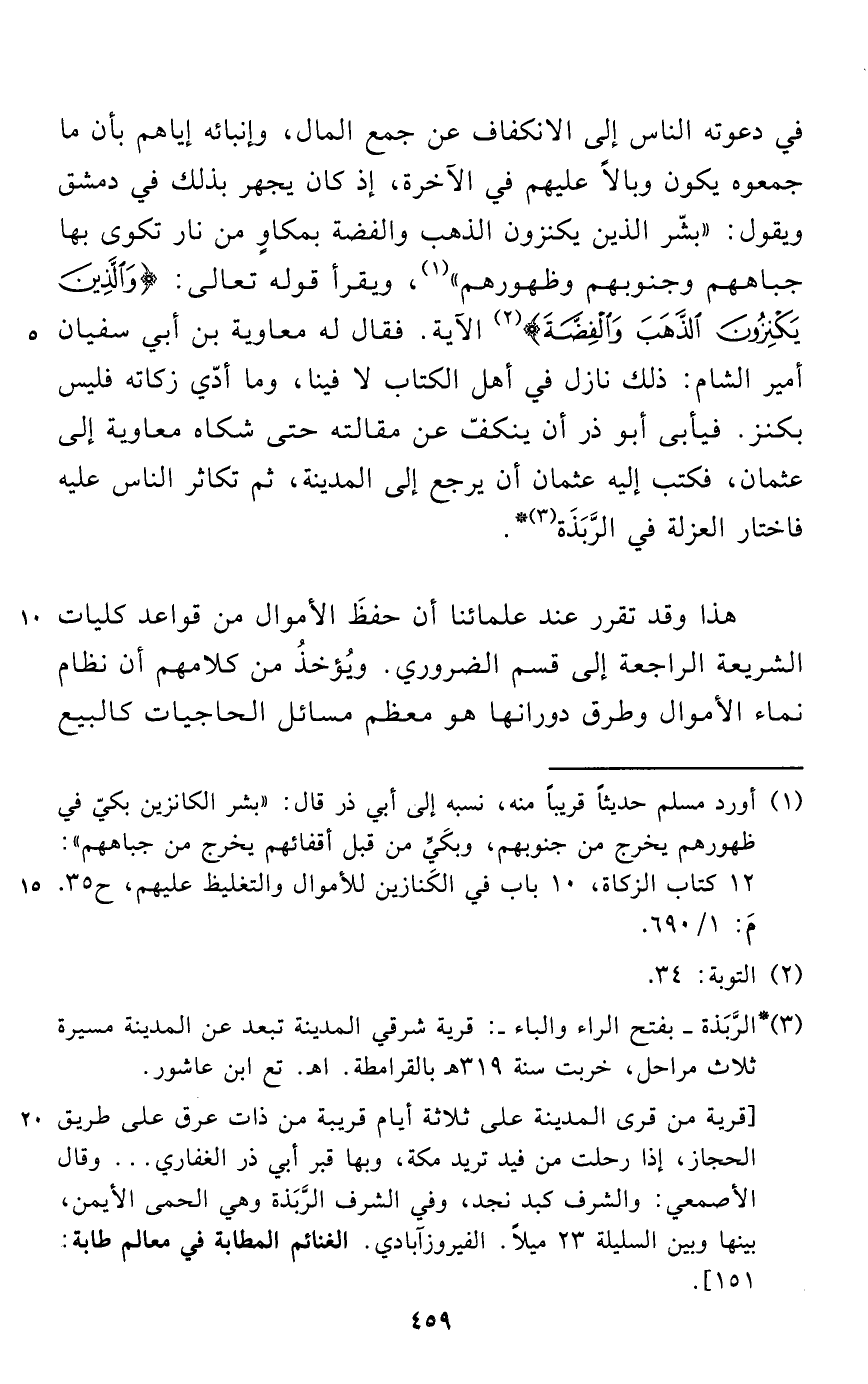 في دعوته الناس إلى الانكفاف عن جمع المال، وإنبائه إياهم بأن ما جمعوه يكون وبالاً عليهم في الآخرة، إذ كان يجهر بذلك في دمشق ويقول: "بشّر الذين يكنزون الذهب والفضة بمكاوٍ من نار تكوى بها جباههم وجنوبهم وظهورهم" (¬1)، ويقرأ قوله تعالى: {وَالَّذِينَ يَكْنِزُونَ الذَّهَبَ وَالْفِضَّةَ} (¬2) الآية. فقال له معاوية بن أبي سفيان أمير الشام: ذلك نازل في أهل الكتاب لا فينا، وما أدّي زكاته فليس بكنز. فيأبى أبو ذر أن ينكفّ عن مقالته حتى شكاه معاوية إلى عثمان، فكتب إليه عثمان أن يرجع إلى المدينة، ثم تكاثر الناس عليه فاختار العزلة في الرَّبَذَة (¬3) *.